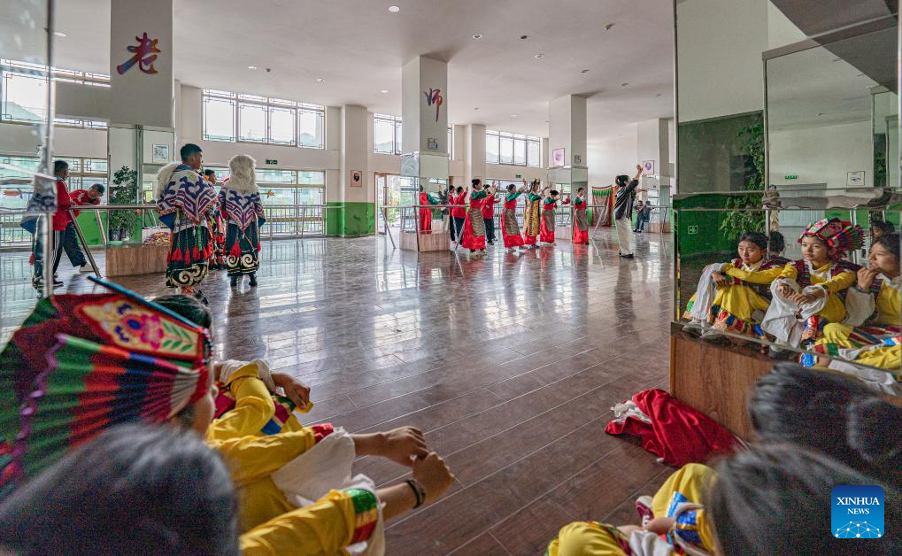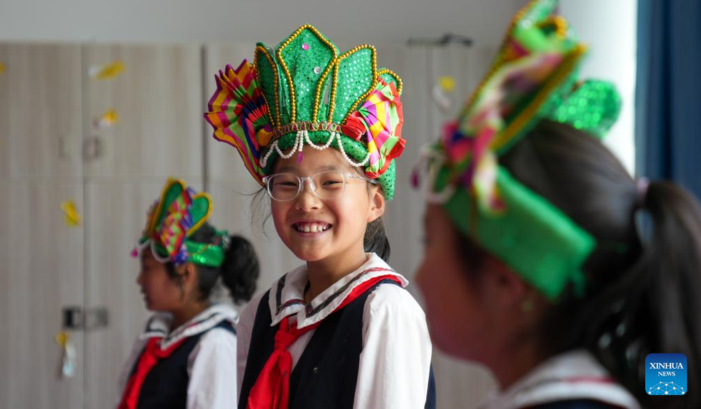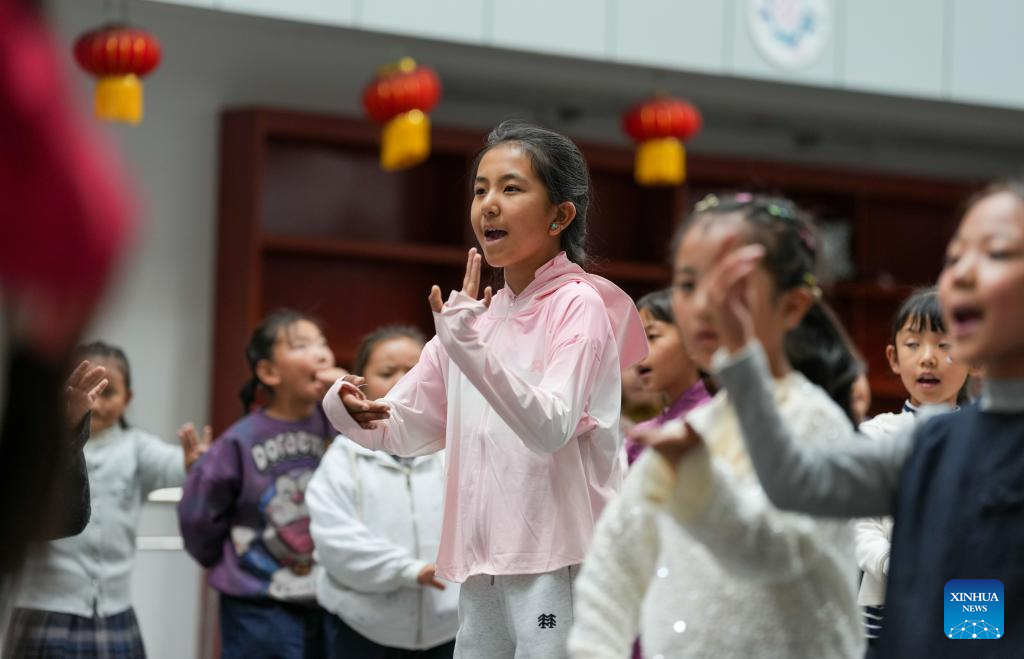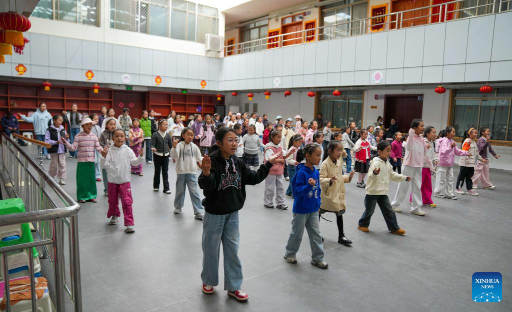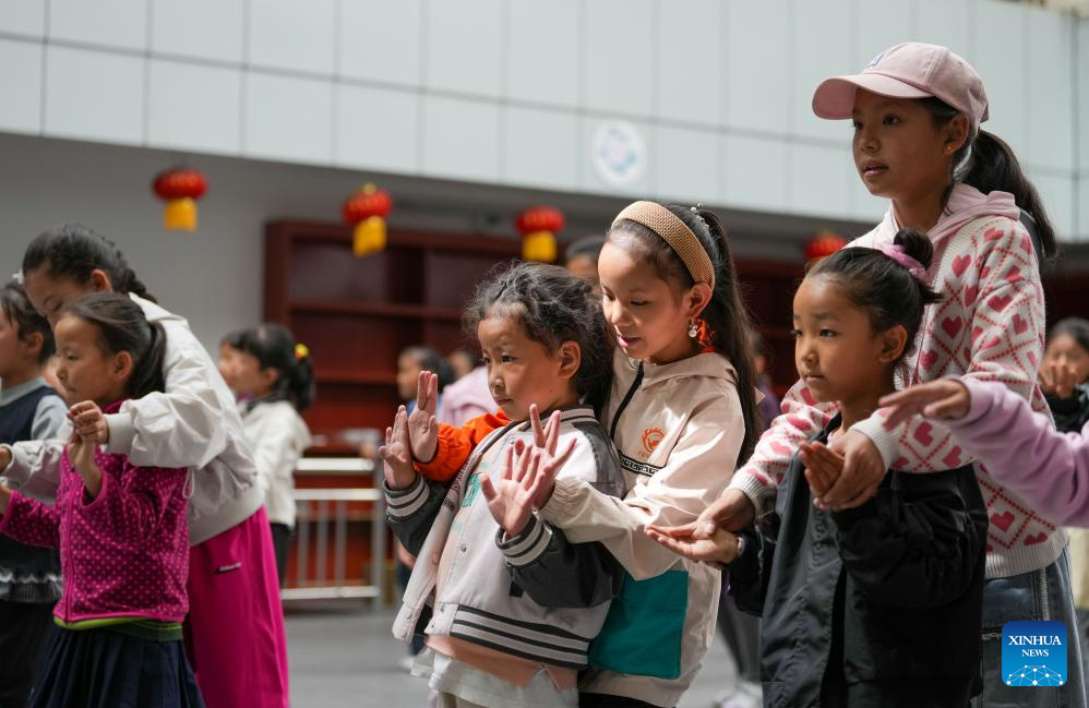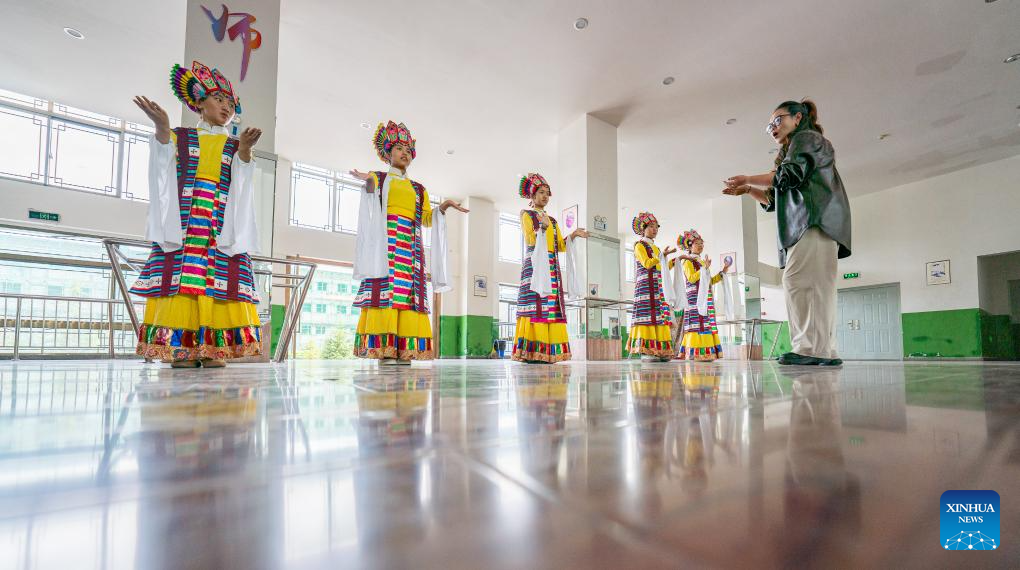 Students practice Tibetan opera at Lhasa Experimental Primary School in Lhasa, southwest China's Xizang Autonomous Region, Sept. 11, 2025.