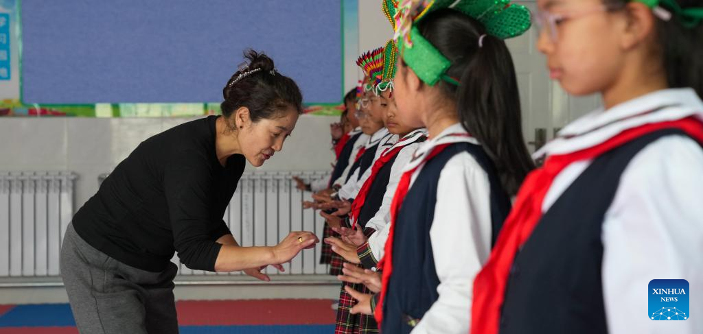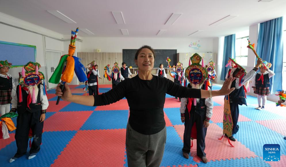 A Tibetan opera teacher gives a lesson at Lhasa Experimental Primary School in Lhasa, southwest China's Xizang Autonomous Region, Sept. 11, 2025.