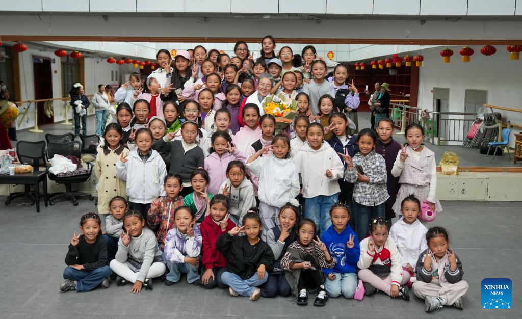 Teacher Pasang and Tibetan opera students pose for a group photo at a public art center in Lhasa, southwest China's Xizang Autonomous Region, Sept. 14, 2025.