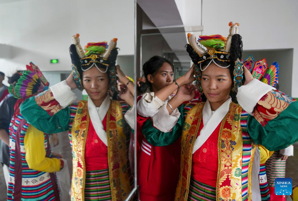 Students put on Tibetan opera costumes at Lhasa No. 2 secondary vocational and technical school in Lhasa, southwest China's Xizang Autonomous Region, Sept. 9, 2025.