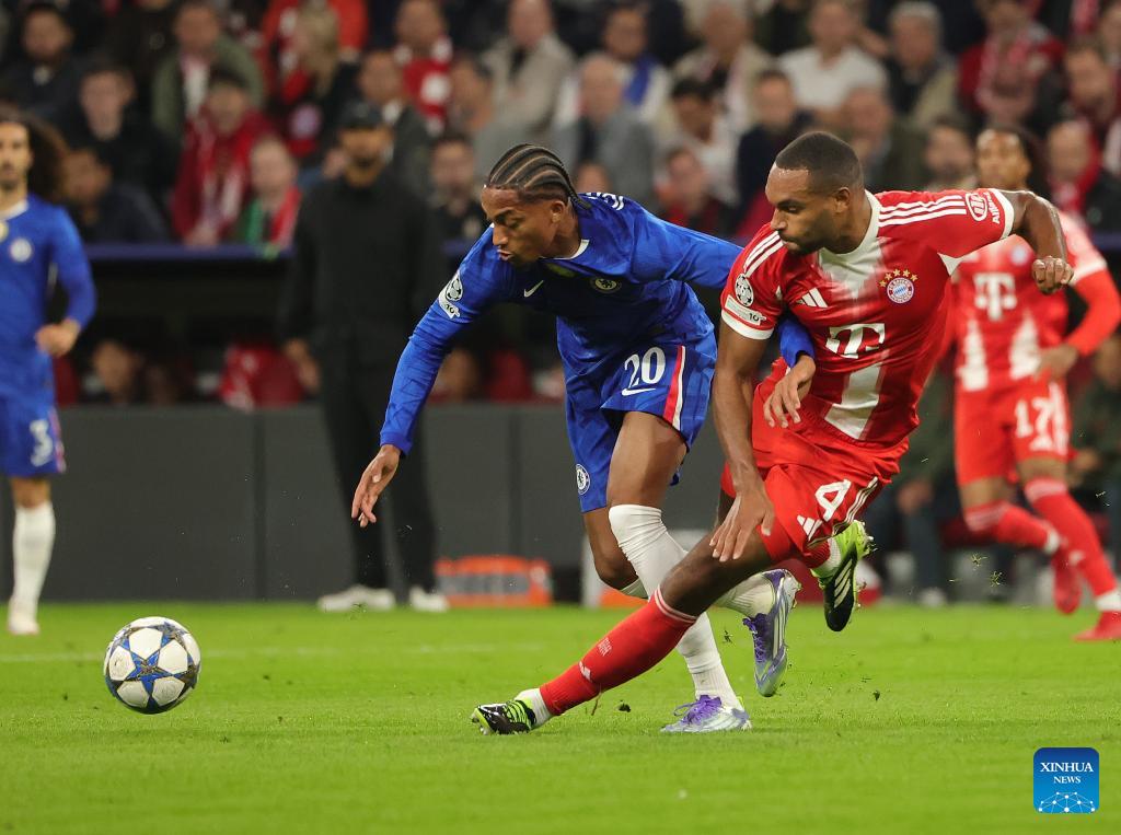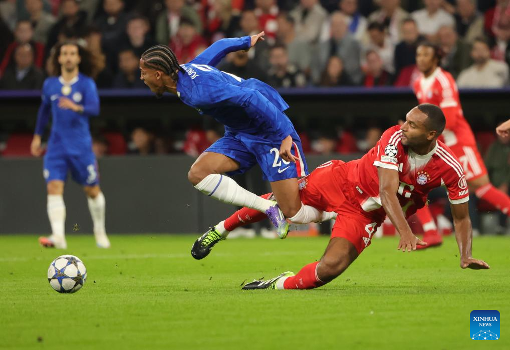 Joao Pedro (L) of Chelsea breaks through during the first round match of UEFA Champions League between Bayern Munich and Chelsea FC in Munich, Germany, on Sept. 17, 2025. (Photo by Philippe Ruiz/Xinhua)