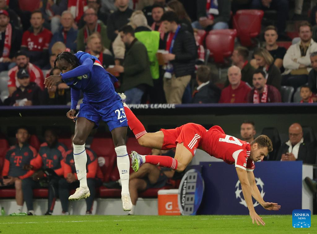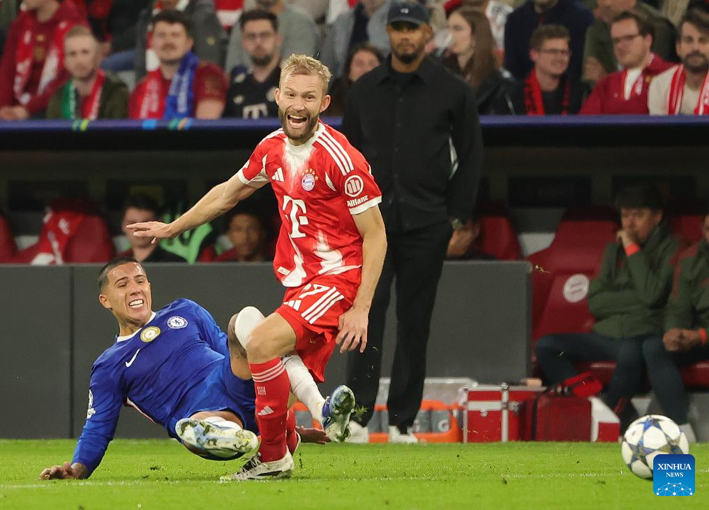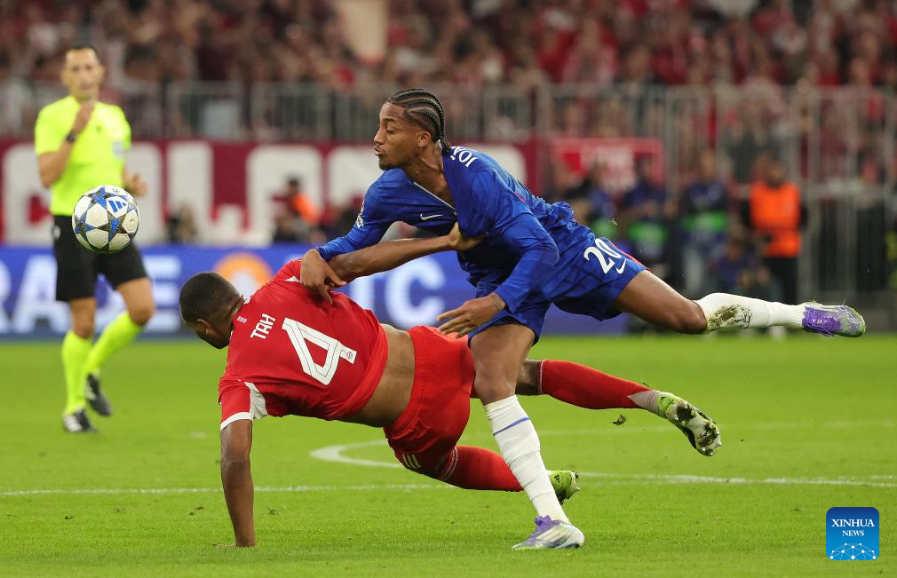 Enzo Fernandez (L) of Chelsea vies with Konrad Laimer of Bayern Munich during the first round match of UEFA Champions League between Bayern Munich and Chelsea FC in Munich, Germany, on Sept. 17, 2025. (Photo by Philippe Ruiz/Xinhua)