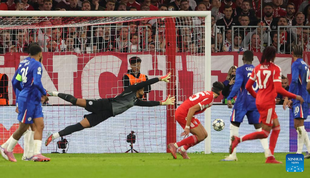 Robert Sanchez (2nd L), goalkeeper of Chelsea, makes a save during the first round match of UEFA Champions League between Bayern Munich and Chelsea FC in Munich, Germany, on Sept. 17, 2025. (Photo by Philippe Ruiz/Xinhua)