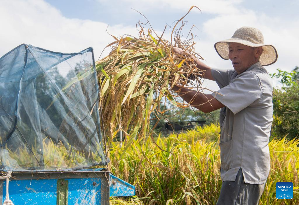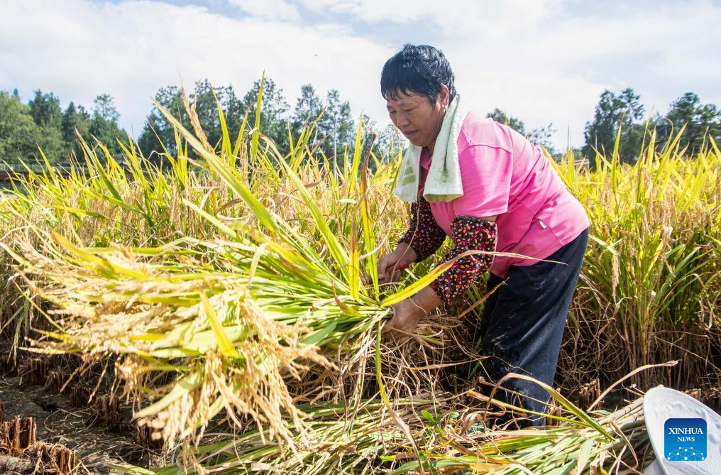 A farmer works in a paddy field in Wuli Town, Qianjiang District, southwest China's Chongqing Municipality, Sept. 18, 2025. Chongqing's Wuli Town, which is home to about 5,300 mu (about 353.33 hectares) of paddy fields, has recently entered the rice harvest season. (Xinhua/Tang Yi)
