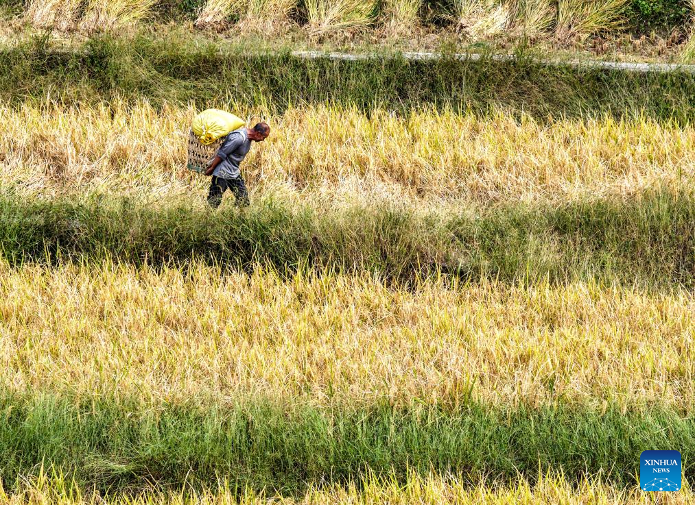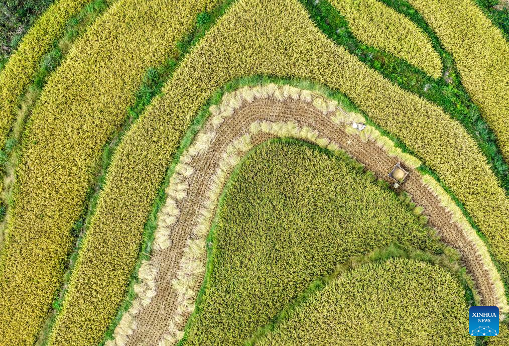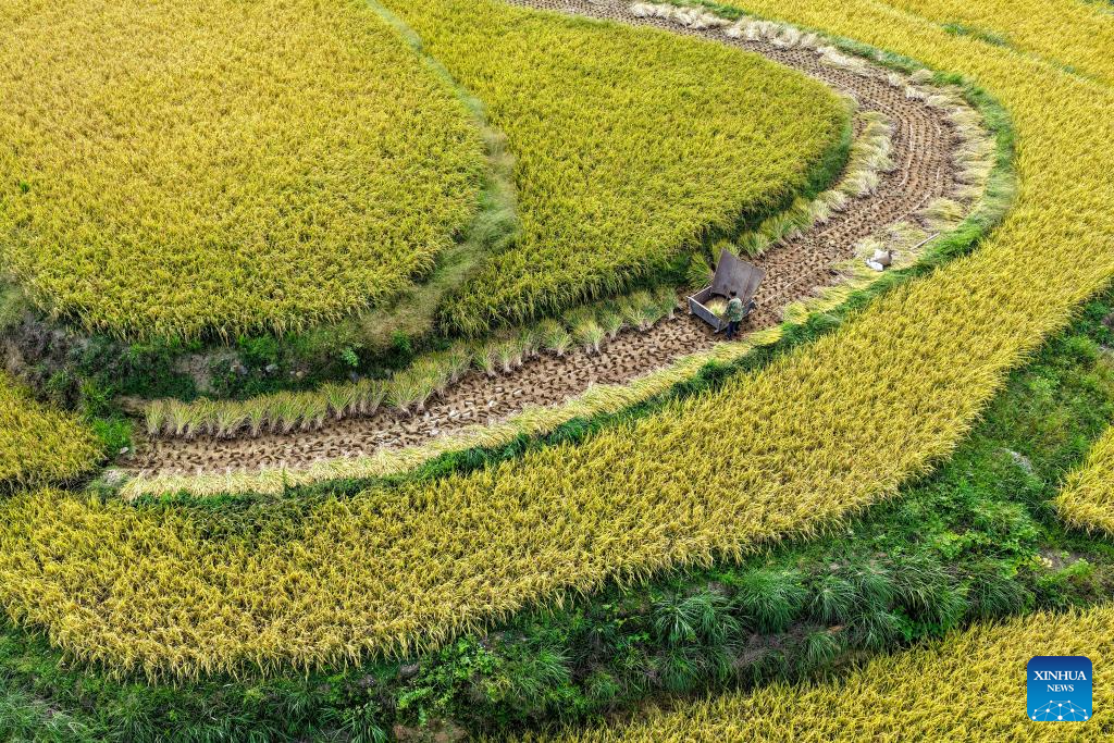 A drone photo taken on Sept. 18, 2025 shows a farmer transporting harvests in a terraced field in Wuli Town, Qianjiang District, southwest China's Chongqing Municipality. Chongqing's Wuli Town, which is home to about 5,300 mu (about 353.33 hectares) of paddy fields, has recently entered the rice harvest season. (Xinhua/Tang Yi)