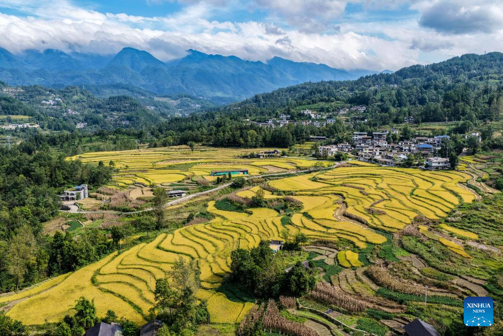 An aerial drone photo taken on Sept. 18, 2025 shows terraced fields in Wuli Town, Qianjiang District, southwest China's Chongqing Municipality. Chongqing's Wuli Town, which is home to about 5,300 mu (about 353.33 hectares) of paddy fields, has recently entered the rice harvest season. (Xinhua/Tang Yi)