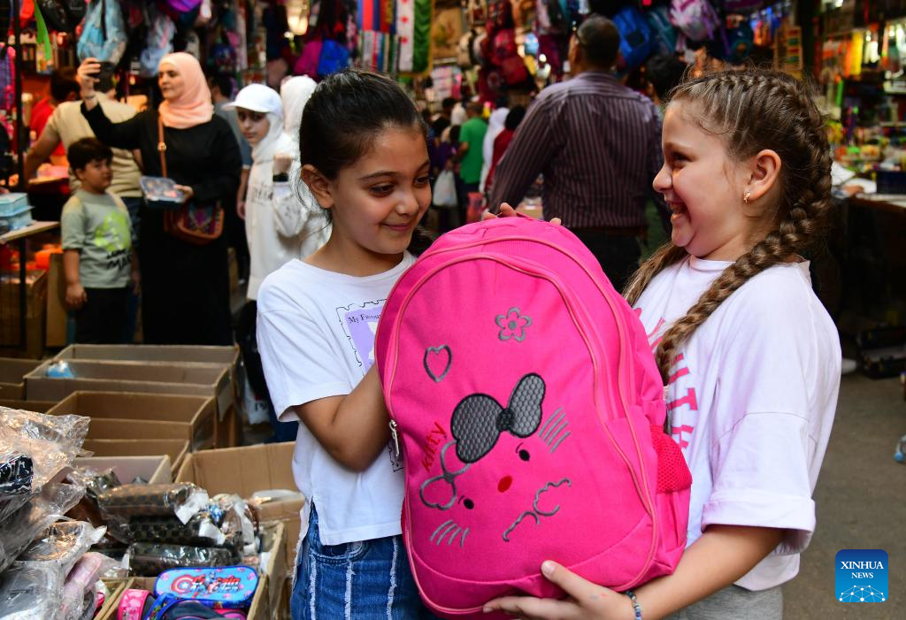 Girls shop for a schoolbag as the new school year approaches at a market in old Damascus, Syria, Sept. 17, 2025. (Photo by Ammar Safarjalani/Xinhua)