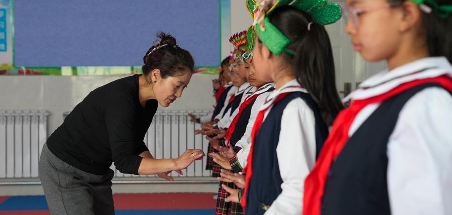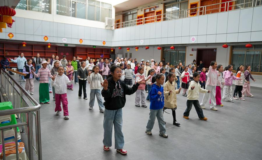 Students practice Tibetan opera at Lhasa Experimental Primary School in Lhasa, southwest China's Xizang Autonomous Region, Sept. 11, 2025. (Xinhua/Jigme Dorje)