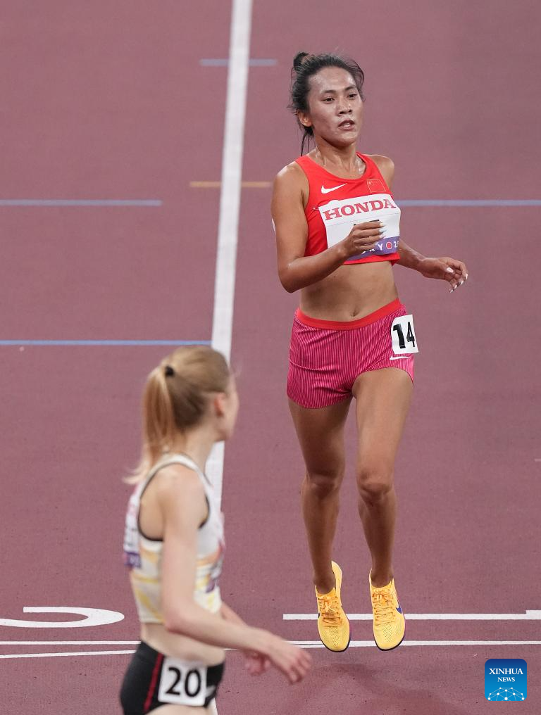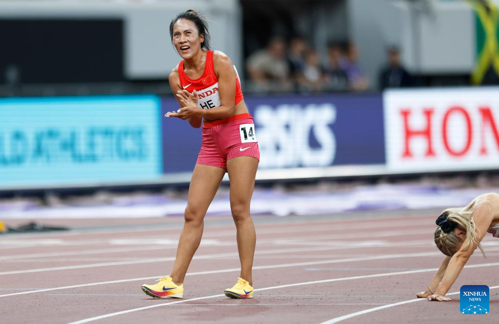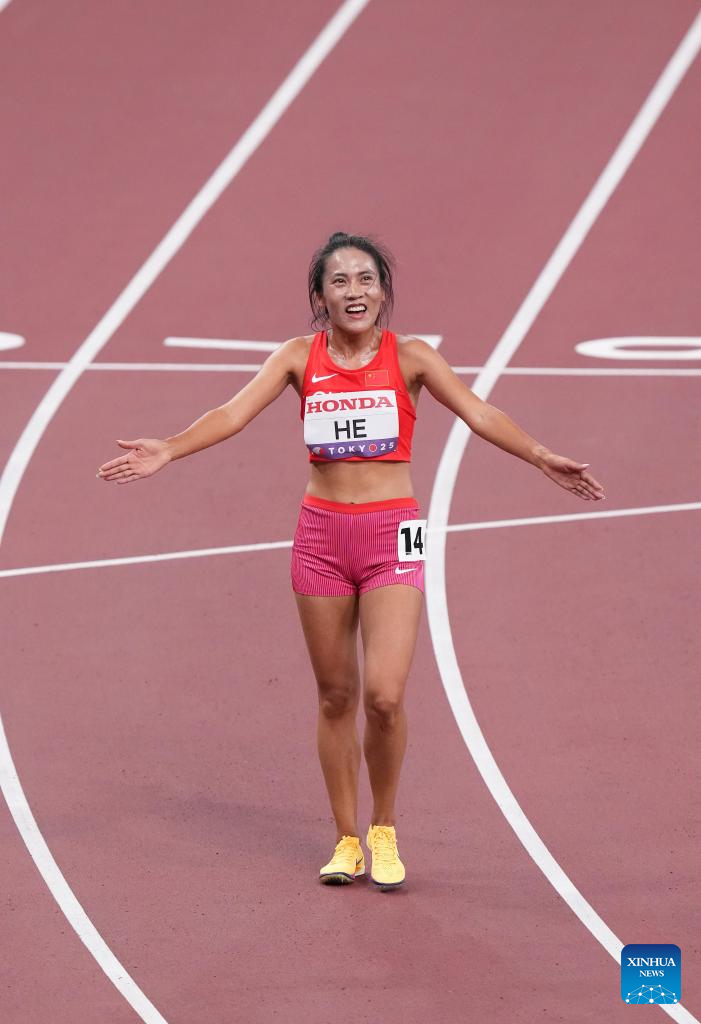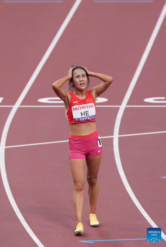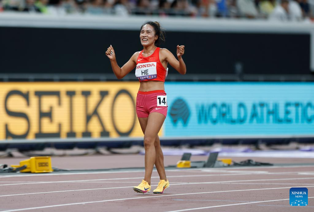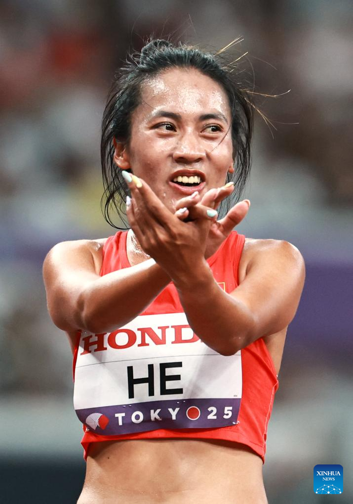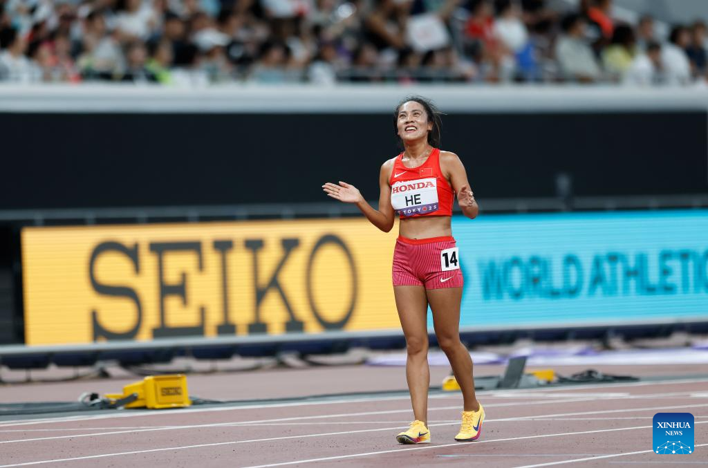 He Wuga of China reacts after the women's 5000m heat at the 2025 World Athletics Championships in Tokyo, Japan, Sept. 18, 2025. (Xinhua/Wang Lili)