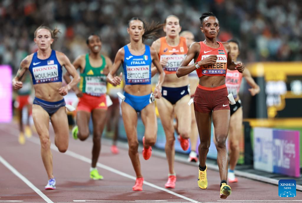 Beatrice Chebet (1st R) of Kenya crosses the finish line during the women's 5000m heat at the 2025 World Athletics Championships in Tokyo, Japan, Sept. 18, 2025. (Xinhua/Jiang Han)
