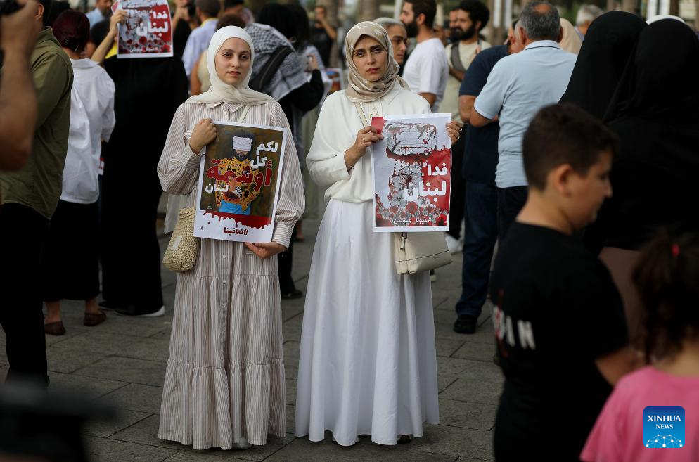 People hold signs showing support for the victims of the pager explosion on the first anniversary of the attack in Beirut, Lebanon, on Sept. 17, 2025. (Xinhua/Bilal Jawich)