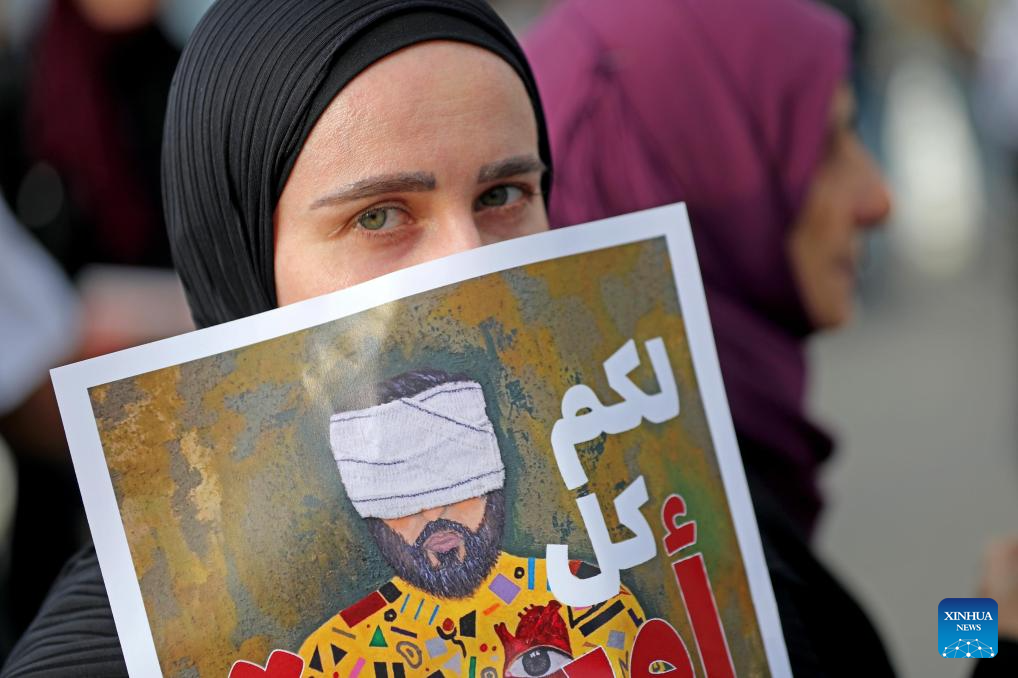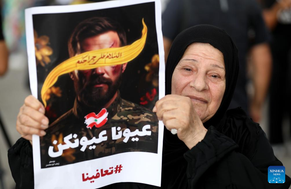 A woman holds a sign showing support for the victims of the pager explosion on the first anniversary of the attack in Beirut, Lebanon, on Sept. 17, 2025. (Xinhua/Bilal Jawich)