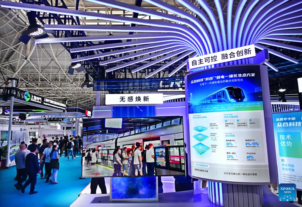 People visit the China International Metro Transit Exhibition in Qingdao, east China's Shandong Province, on Sept. 18, 2025. The exhibition was held in the West Coast New Area of Qingdao on Thursday, setting up exhibition areas such as vehicle system and equipment supply chain, signal communication system, IT technology, and artificial intelligence. (Xinhua/Li Ziheng)