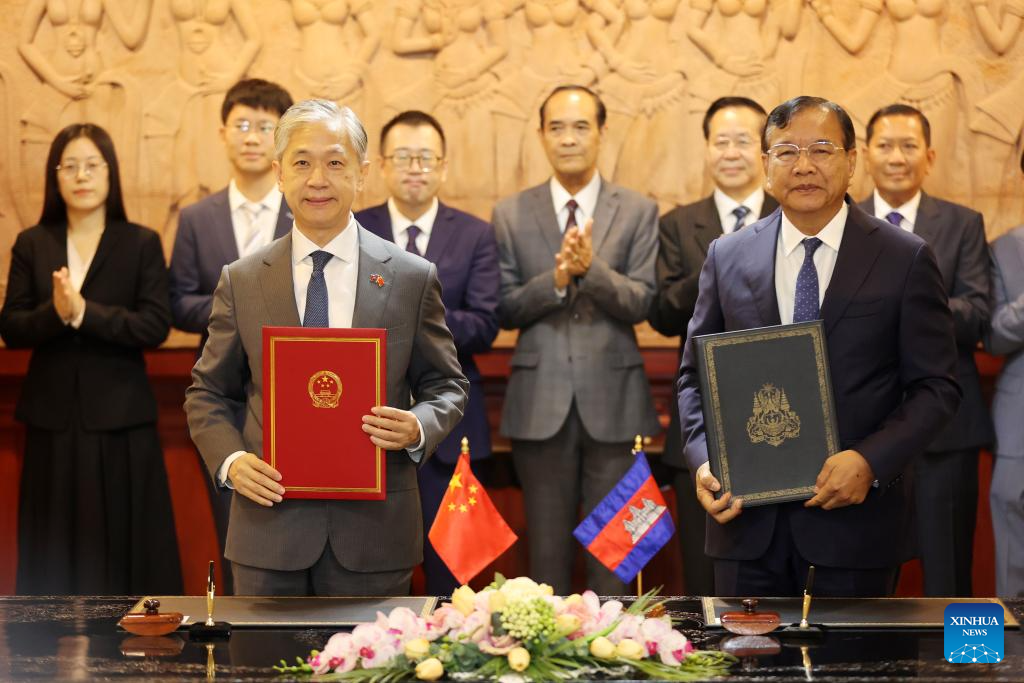 Cambodian Deputy Prime Minister and Foreign Minister Prak Sokhonn (R) and Chinese Ambassador to Cambodia Wang Wenbin attend a signing ceremony of Lancang-Mekong Cooperation (LMC) Special Fund 2025 for Cambodia in Phnom Penh, Cambodia on Sept. 17, 2025. (Photo by Sovannara/Xinhua)