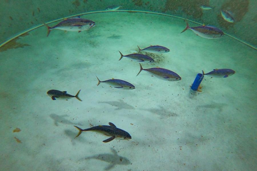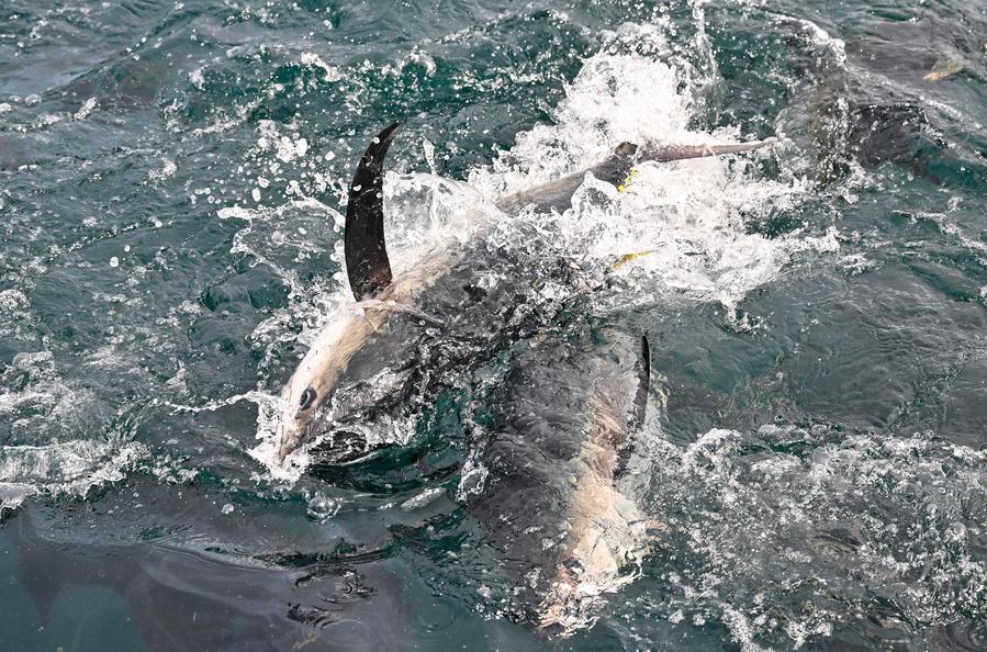 This photo taken on Sept. 17, 2025 shows tunas vying for food at an offshore yellowfin tuna breeding base in Lingshui Li Autonomous County, south China's Hainan Province. (Xinhua/Guo Cheng)A staff member of the South China Sea Fisheries Research Institute of the Chinese Academy of Fishery Sciences conducts scientific research on the breeding of yellowfin tunas in Lingshui Li Autonomous County, south China's Hainan Province, on Sept. 17, 2025. (Xinhua/Guo Cheng)This photo taken on Sept. 17, 2025 shows yellowfin tunas undergoing an experiment at the South China Sea Fisheries Research Institute of the Chinese Academy of Fishery Sciences in Lingshui Li Autonomous County, south China's Hainan Province. (Xinhua/Guo Cheng)A staff member of the South China Sea Fisheries Research Institute of the Chinese Academy of Fishery Sciences conducts scientific research on the breeding of yellowfin tunas in Lingshui Li Autonomous County, south China's Hainan Province, on Sept. 17, 2025. (Xinhua/Guo Cheng)Qin Chuanxin, a researcher at the South China Sea Fisheries Research Institute of the Chinese Academy of Fishery Sciences, shows a specimen of yellowfin tuna in Lingshui Li Autonomous County, south China's Hainan Province, on Sept. 17, 2025. (Xinhua/Guo Cheng)Staff members are on the way to an offshore yellowfin tuna breeding base by boat in Lingshui Li Autonomous County, south China's Hainan Province, on Sept. 17, 2025. (Xinhua/Guo Cheng)A staff member of the South China Sea Fisheries Research Institute of the Chinese Academy of Fishery Sciences conducts scientific research on the breeding of yellowfin tunas in Lingshui Li Autonomous County, south China's Hainan Province, on Sept. 17, 2025. (Xinhua/Guo Cheng)A staff member feeds tunas at an offshore yellowfin tuna breeding base in Lingshui Li Autonomous County, south China's Hainan Province, on Sept. 17, 2025. (Xinhua/Guo Cheng)An aerial drone photo taken on Sept. 17, 2025 shows staff members feeding tunas at an offshore yellowfin tuna breeding base in Lingshui Li Autonomous County, south China's Hainan Province. (Xinhua/Guo Cheng)■