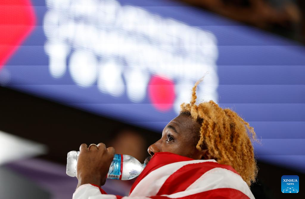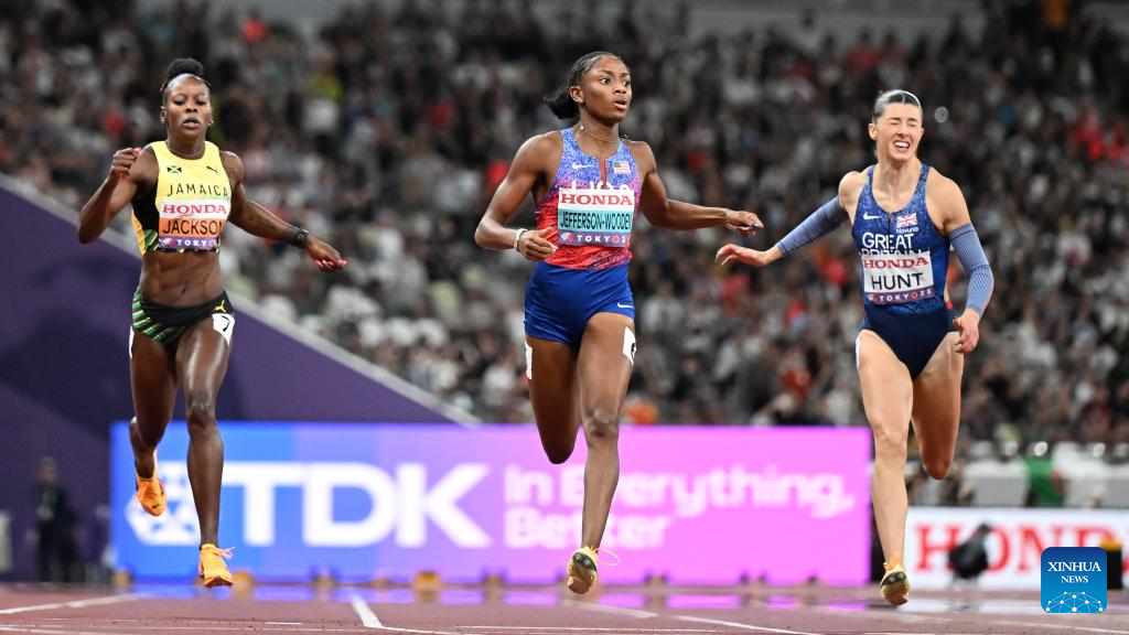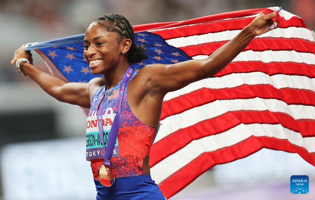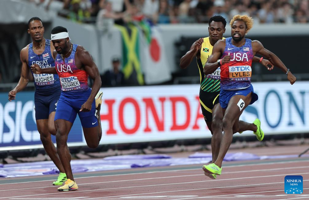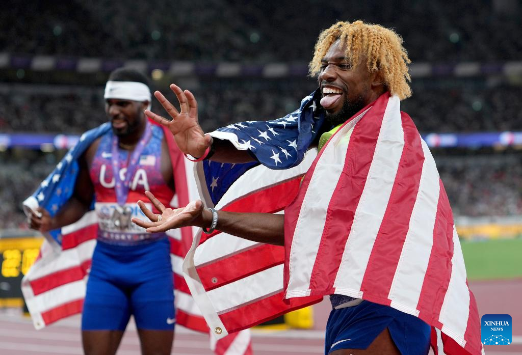 TOKYO, Sept. 19 (Xinhua) -- American sprinters showcased their dominance in the 200 meters at the World Athletics Championships on Friday, with Noah Lyles clinching his fourth consecutive victory in the men's event, while Melissa Jefferson-Wooden secured the women's title.