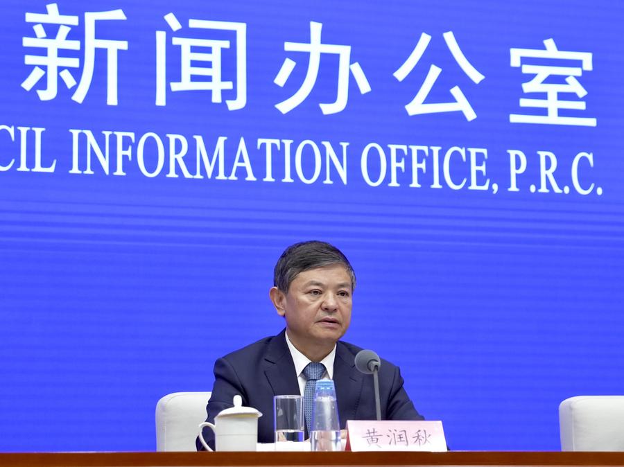 Chinese Minister of Ecology and Environment Huang Runqiu attends a press conference held by the State Council Information Office (SCIO) on promoting high-quality development through high-level ecological and environmental protection in Beijing, capital of China, Sept. 19, 2025. (Xinhua/Cai Yang)