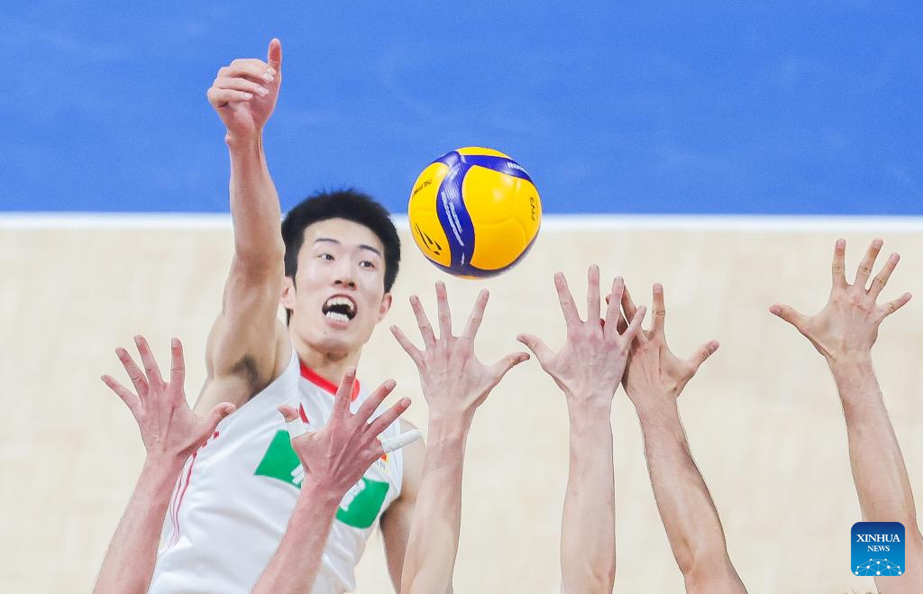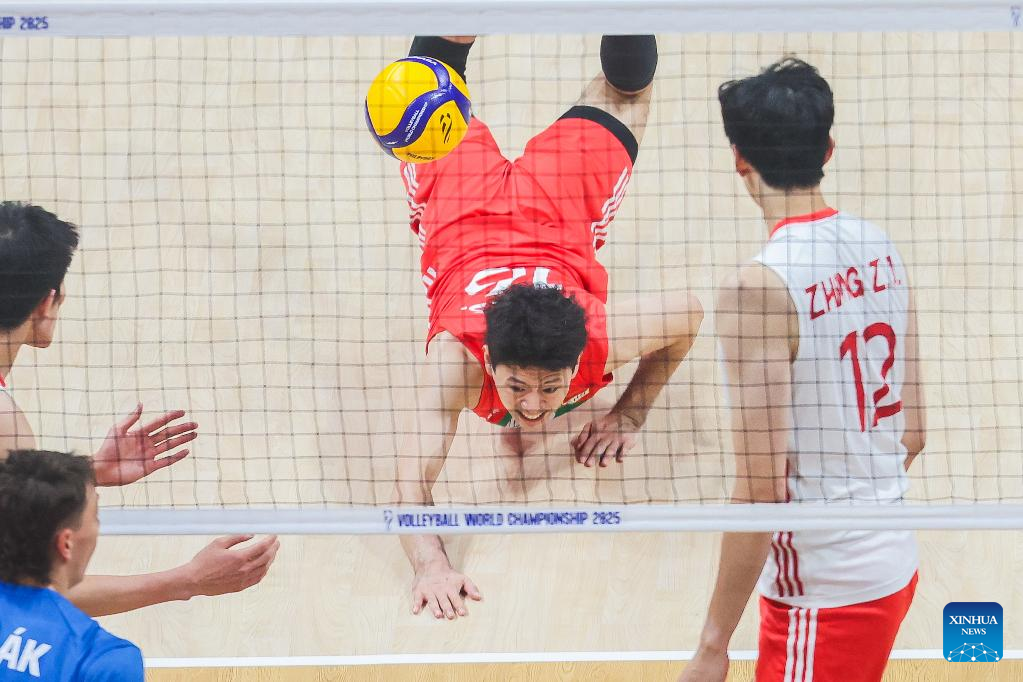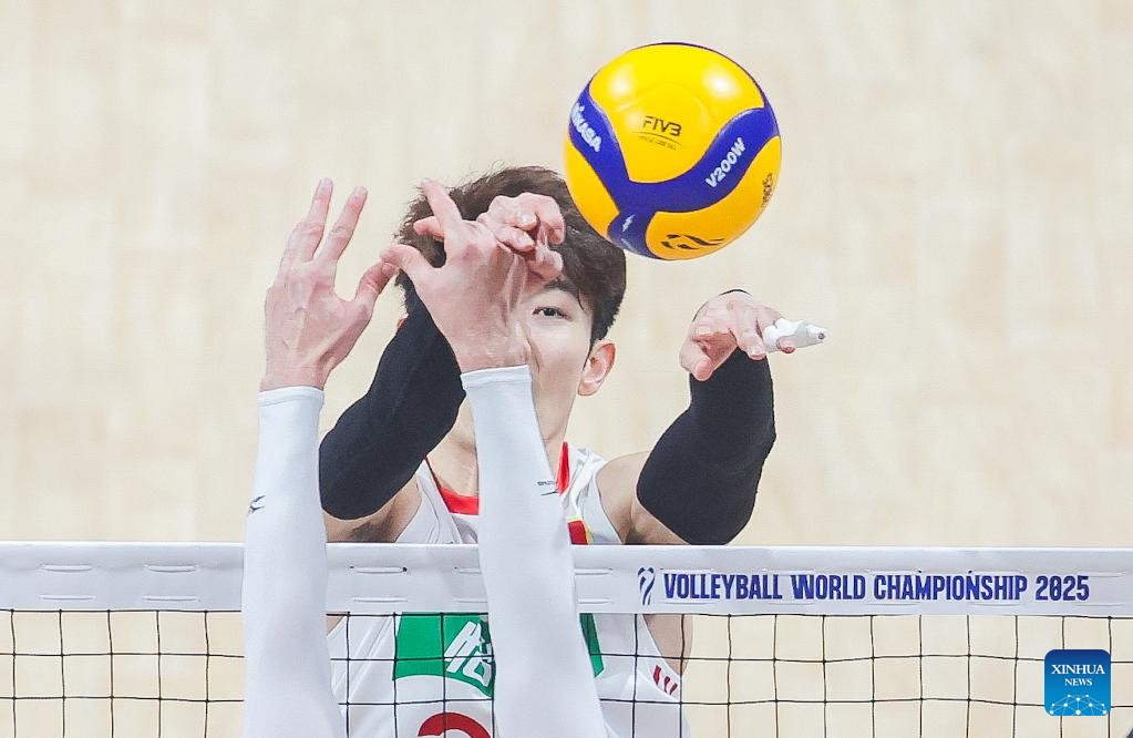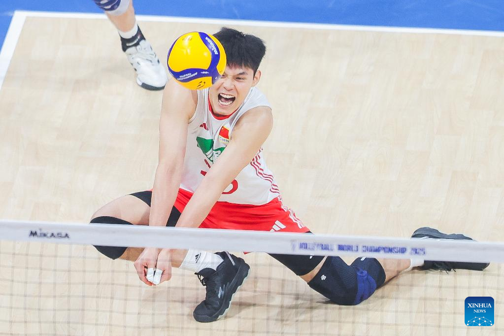 Qu Zongshuai (C) of China competes during the pool H match between China and the Czech Republic at the FIVB Men's World Championship 2025 in Pasay City, the Philippines, Sept. 18, 2025. (Xinhua/Rouelle Umali)