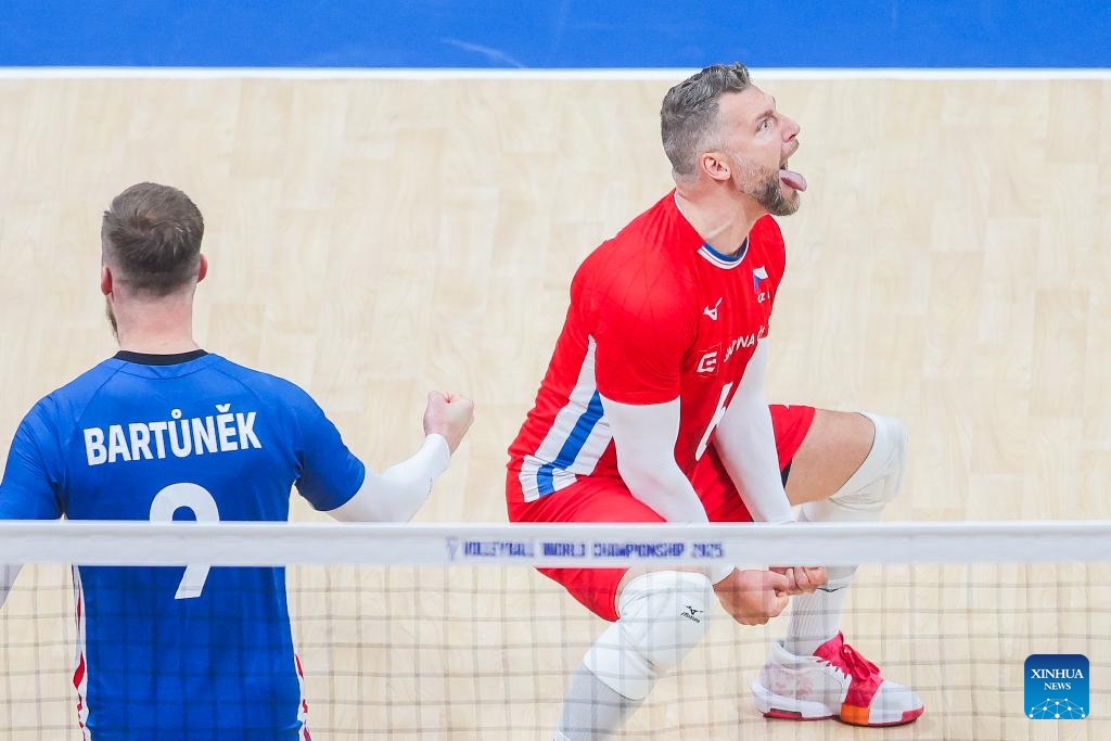 Players of the Czech Republic celebrate after scoring a point during the pool H match between China and the Czech Republic at the FIVB Men's World Championship 2025 in Pasay City, the Philippines, Sept. 18, 2025. (Xinhua/Rouelle Umali)