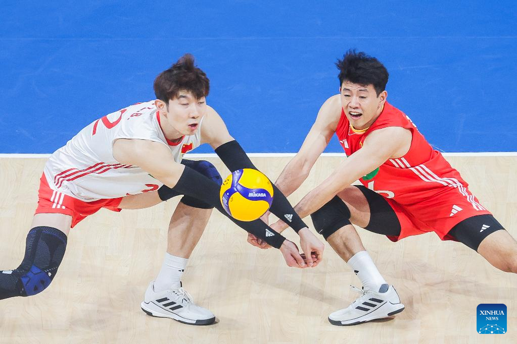 Qu Zongshuai (R) and Liu Libin (L) of China compete during the pool H match between China and the Czech Republic at the FIVB Men's World Championship 2025 in Pasay City, the Philippines, Sept. 18, 2025. (Xinhua/Rouelle Umali)