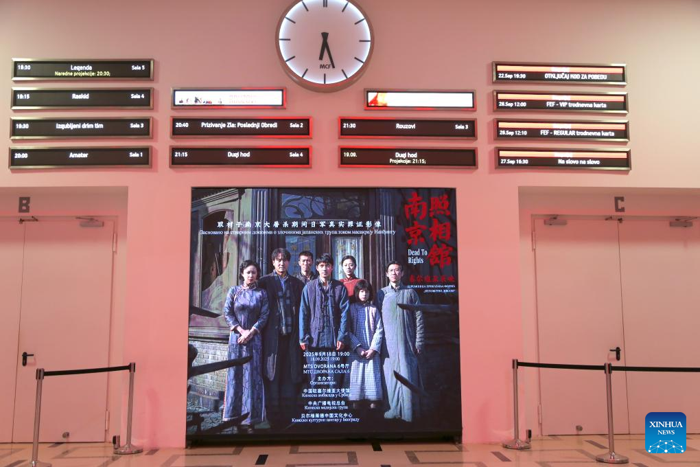 This photo shows a poster of Chinese wartime film "Dead to Rights" (Nanjing Photo Studio) at a cinema in Belgrade, Serbia, Sept. 18, 2025. (Xinhua/Chen Ying)