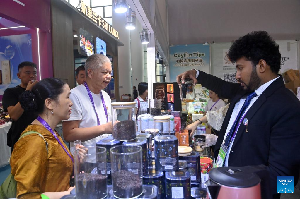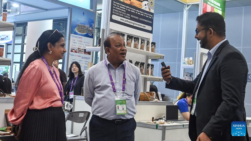Merchants negotiate at the Sri Lanka pavilion during the ongoing 22nd China-ASEAN Expo in Nanning, south China's Guangxi Zhuang Autonomous Region, Sept. 20, 2025. Products from Sri Lanka draw attention and popularity at the 22nd China-ASEAN Expo. (Xinhua/Zhang Ailin)