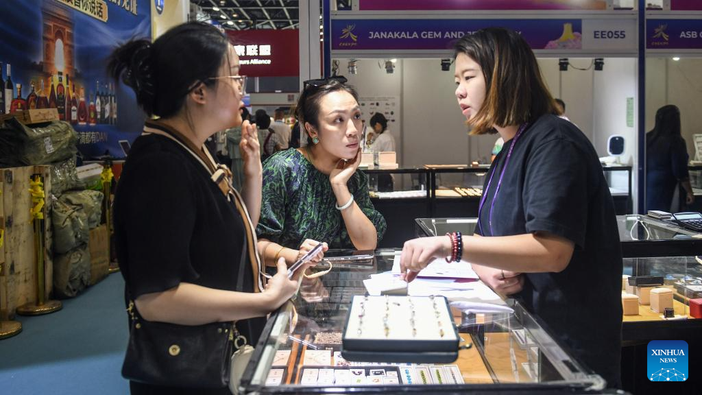 People select gems at the Sri Lanka pavilion during the ongoing 22nd China-ASEAN Expo in Nanning, south China's Guangxi Zhuang Autonomous Region, Sept. 20, 2025. Products from Sri Lanka draw attention and popularity at the 22nd China-ASEAN Expo. (Xinhua/Zhang Ailin)
