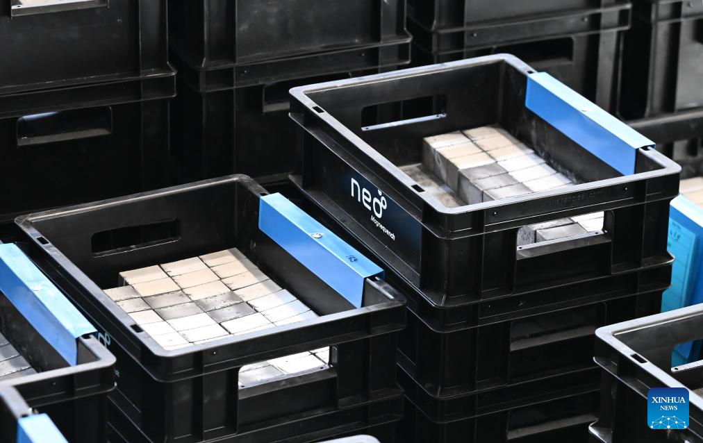 Photo taken on Sept. 19, 2025 shows rare-earth magnetic bars at NEO magnetic plant in Narva, a city in northeastern Estonia. A plant producing rare-earth magnets for Europe's electric vehicle and wind-energy sectors opened Friday in Narva, Estonia. (Photo by Sergei Stepanov/Xinhua)