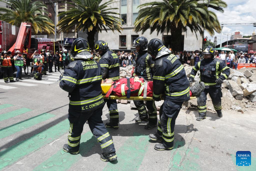 Rescuers work during a nationwide earthquake drill commemorating the 40th anniversary of the 1985 Mexico earthquake, in Mexico City, Mexico, on Sept. 19, 2025. On Sept. 19, 1985, an 8.1-magnitude earthquake hit Mexico, destroying one third of the buildings in the central area of Mexico City and claiming thousands of lives. (Photo by Francisco Canedo/Xinhua)