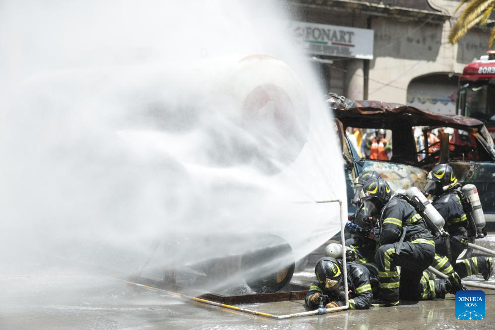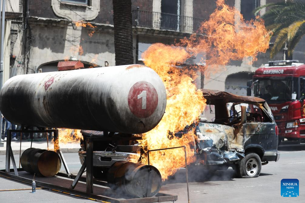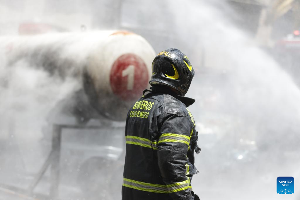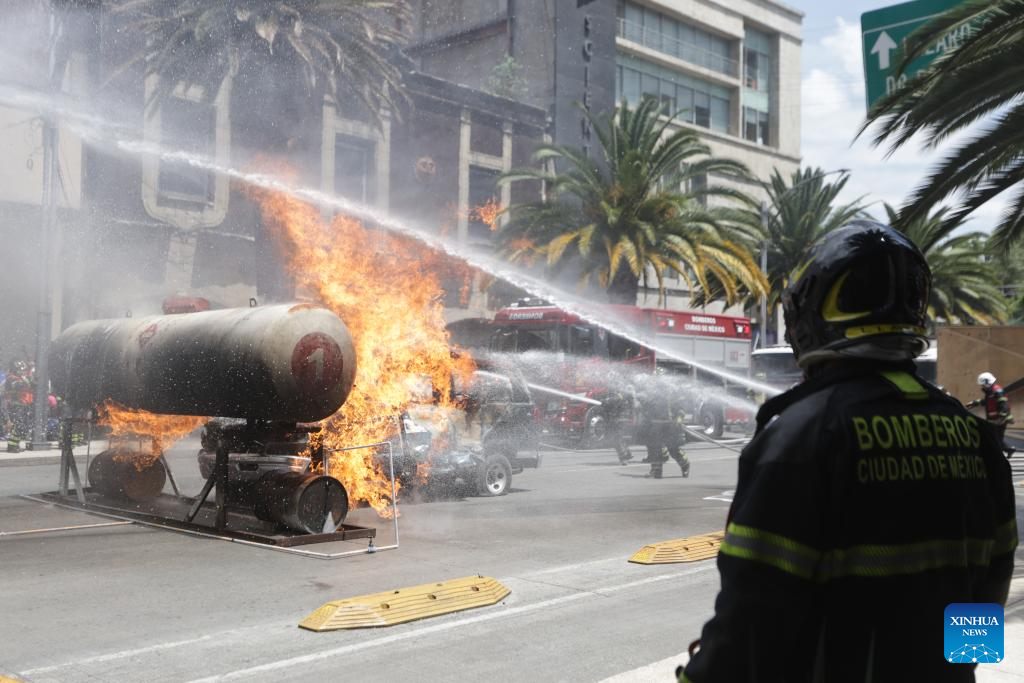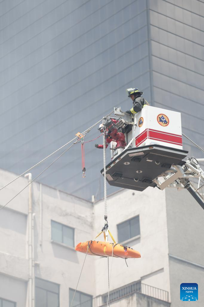 This photo taken on Sept. 19, 2025 shows a scene of fire during a nationwide earthquake drill commemorating the 40th anniversary of the 1985 Mexico earthquake, in Mexico City, Mexico. On Sept. 19, 1985, an 8.1-magnitude earthquake hit Mexico, destroying one third of the buildings in the central area of Mexico City and claiming thousands of lives. (Photo by Francisco Canedo/Xinhua)