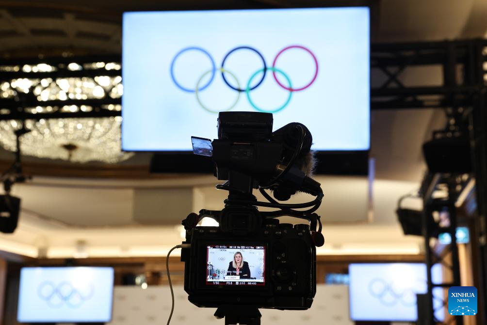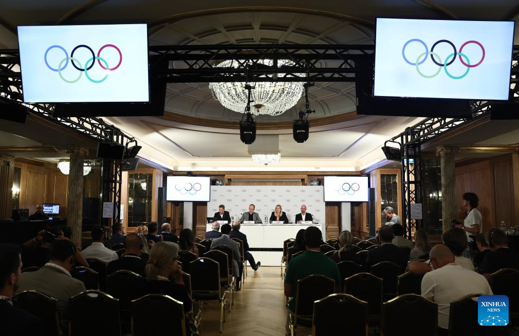 This photo taken on Sept. 19, 2025 shows a press conference held by the IOC Executive Board in Milan, Italy. (Xinhua/Li Jing)