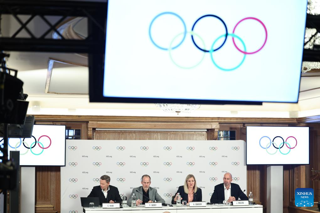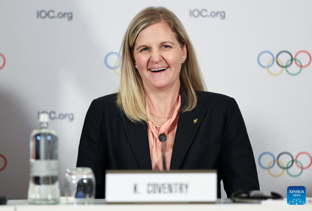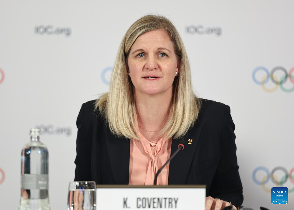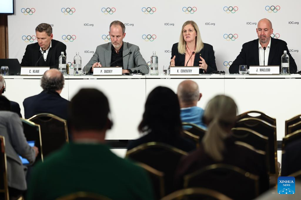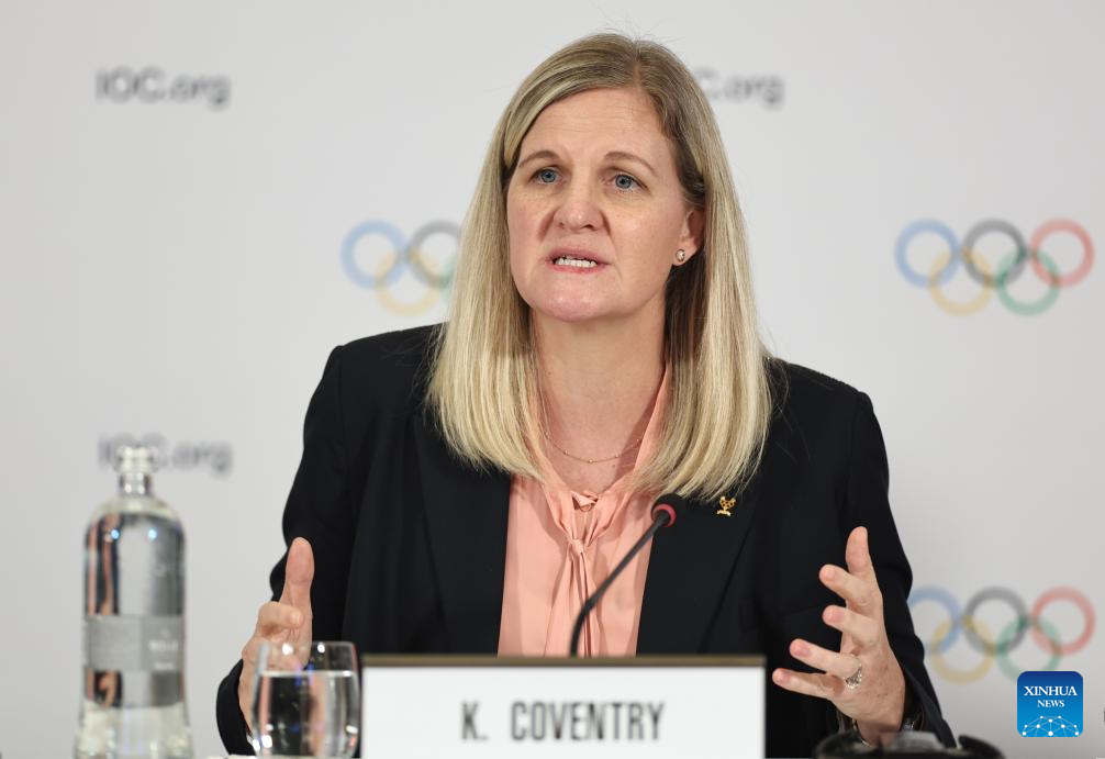 IOC President Kirsty Coventry attends a press conference held by the IOC Executive Board in Milan, Italy, Sept. 19, 2025. (Xinhua/Li Jing)
