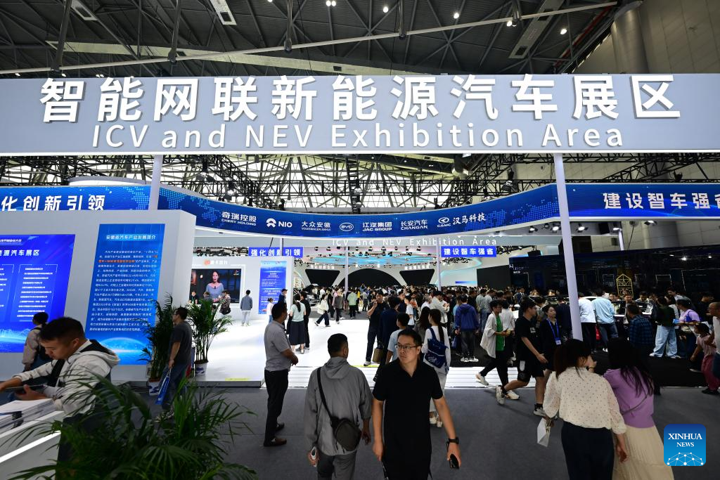 People visit the ICV (Internet-connected vehicles) and NEV (new energy vehicles) Exhibition Area of the 2025 World Manufacturing Convention (WMC) in Hefei, east China's Anhui Province, Sept. 20, 2025. Themed "Intelligent Manufacturing For a Better Future", the 2025 WMC kicked off here on Saturday. (Xinhua/Huang Bohan)