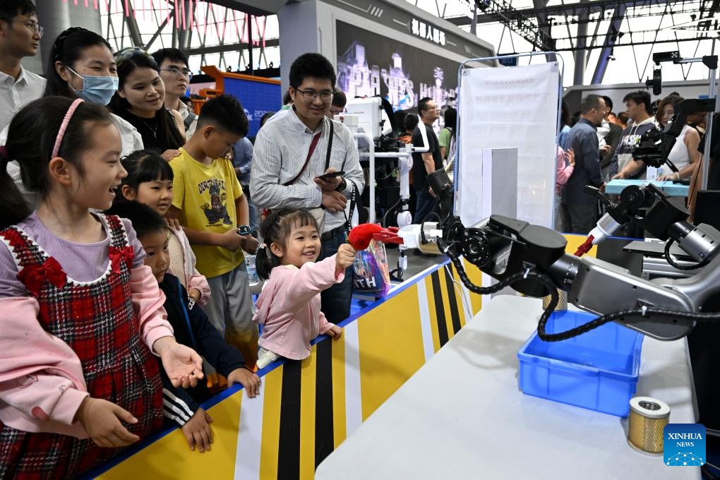 A child interacts with a robot displayed at the 2025 World Manufacturing Convention (WMC) in Hefei, east China's Anhui Province, Sept. 20, 2025. Themed "Intelligent Manufacturing For a Better Future", the 2025 WMC kicked off here on Saturday. (Xinhua/Huang Bohan)