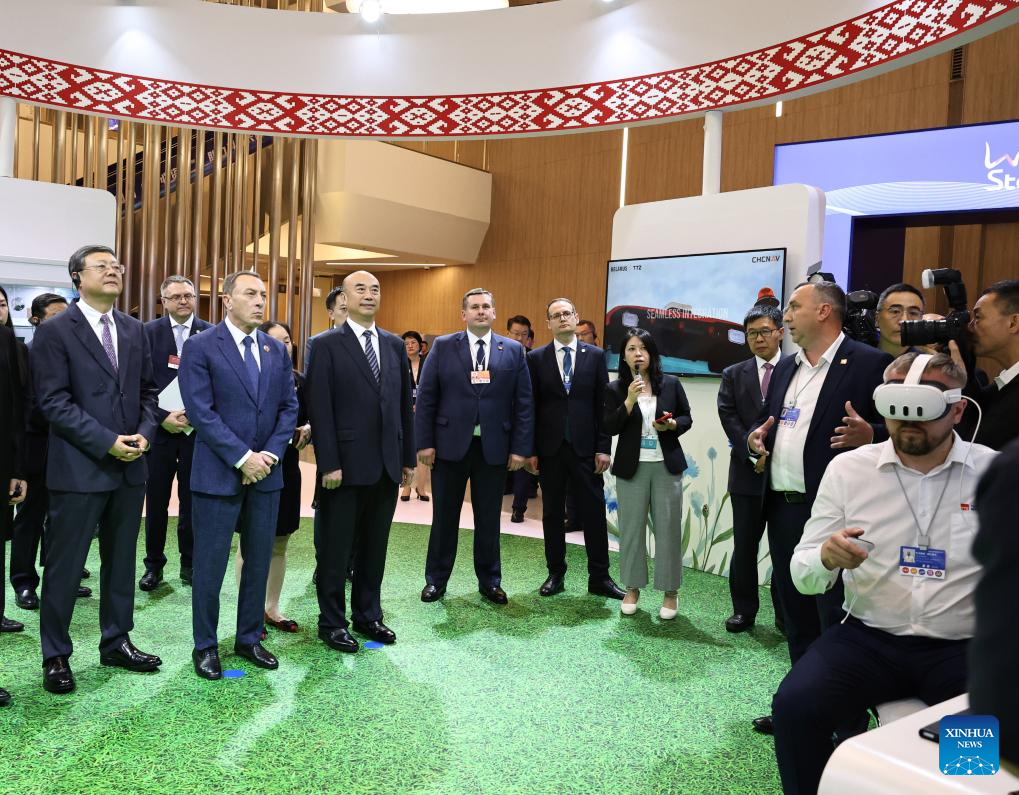 Chinese Vice Premier Liu Guozhong, also a member of the Political Bureau of the Communist Party of China Central Committee, visits an exhibition on achievements in China-Belarus scientific and technological innovation cooperation after the opening ceremony of the 2025 Pujiang Innovation Forum in Shanghai, east China, Sept. 20, 2025. Liu addressed the opening ceremony here on Saturday. (Xinhua/Fang Zhe)