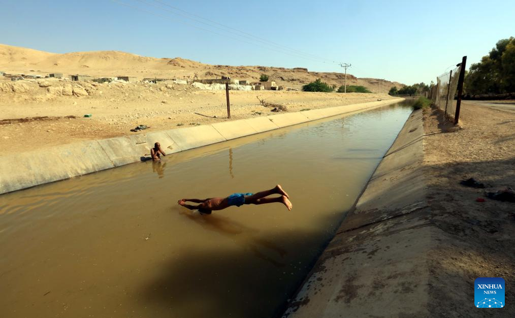 This undated file photo shows people swimming in an irrigation canal in Jordan Valley, Jordan. Jordan is grappling with one of the world's most severe water crises caused by climate change, over-pumping, and rising demand, as local authorities are trying to manage scarcity with a rotation system and large-scale infrastructure projects.(Photo by Mohammad Abu Ghosh/Xinhua)
