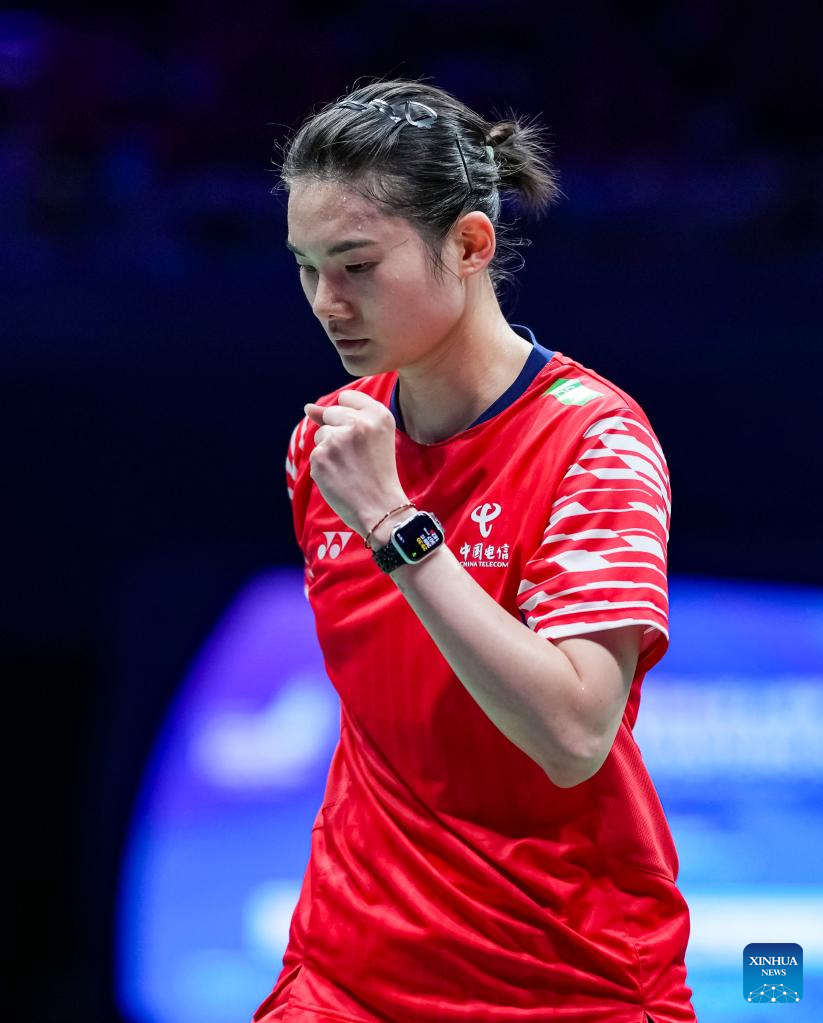 Han Yue of China celebrates a score during the women's singles semifinal match against Kim Ga Eun of South Korea at the China Masters 2025 in Shenzhen, south China's Guangdong Province, Sept. 20, 2025. (Xinhua/Sun Fei)