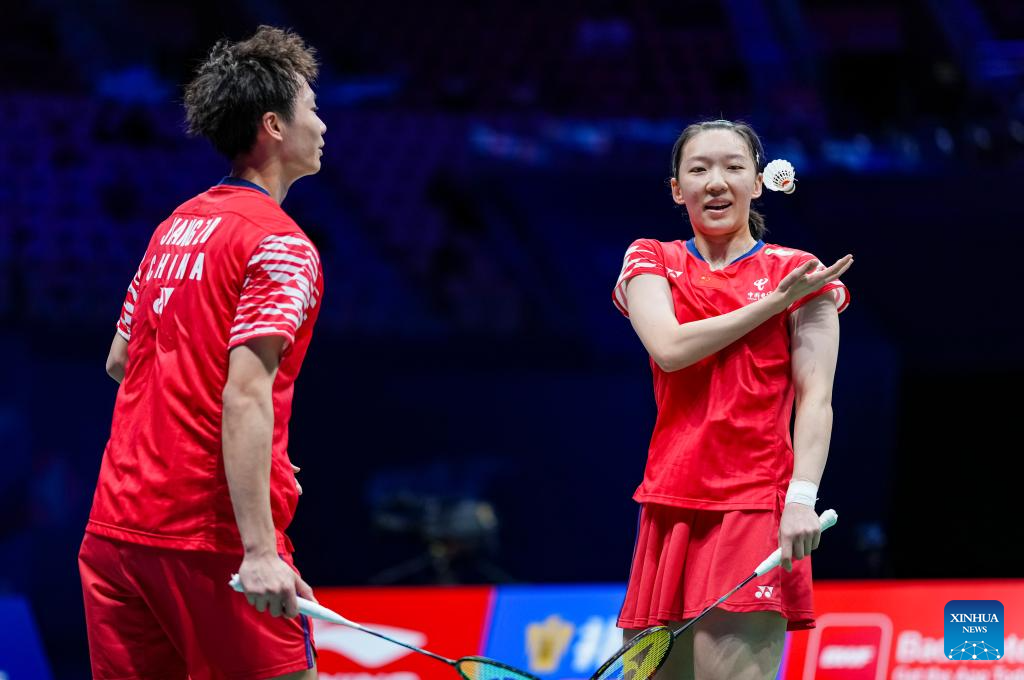 Jiang Zhenbang/Wei Yaxin (R) of China react during the mixed doubles semifinal match against Dechapol Puavaranukroh/Supissara Paewsampran of Thailand at the China Masters 2025 in Shenzhen, south China's Guangdong Province, Sept. 20, 2025. (Xinhua/Sun Fei)