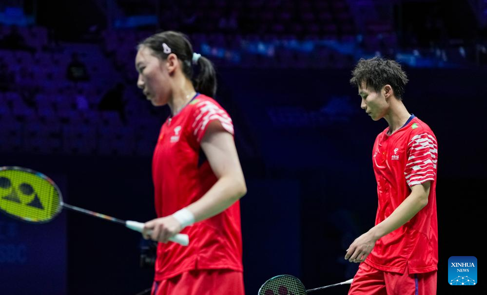 Jiang Zhenbang (R)/Wei Yaxin of China react during the mixed doubles semifinal match against Dechapol Puavaranukroh/Supissara Paewsampran of Thailand at the China Masters 2025 in Shenzhen, south China's Guangdong Province, Sept. 20, 2025. (Xinhua/Sun Fei)
