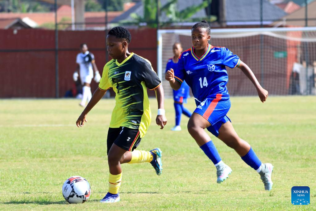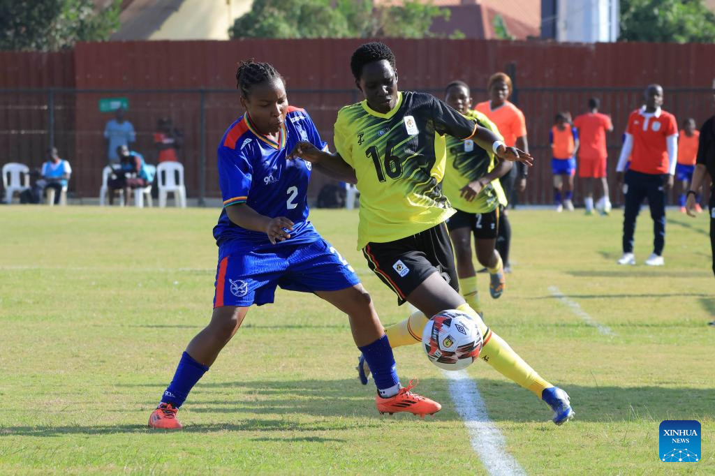 Sumaya Nalumu (L) of Uganda and Onthedute Tokwane of Namibia compete during the FIFA U20 Women's World Cup qualifier match between Uganda and Namibia at FUFA Kadiba Stadium in Kampala, capital of Uganda, on Sept. 19, 2025. (Photo by Hajarah Nalwadda/Xinhua)