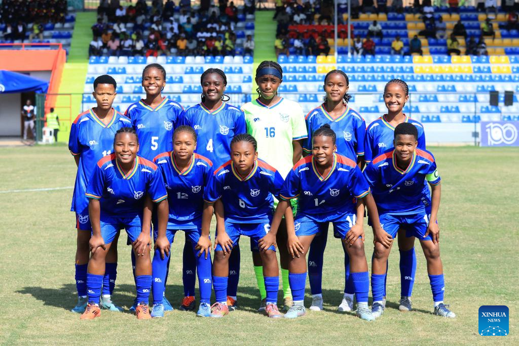 Starting players of Namibia line up before the FIFA U20 Women's World Cup qualifier match between Uganda and Namibia at FUFA Kadiba Stadium in Kampala, capital of Uganda, on Sept. 19, 2025. (Photo by Hajarah Nalwadda/Xinhua)