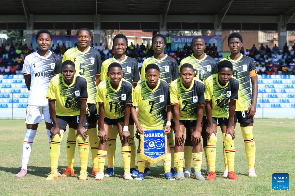 Starting players of Uganda Queen Cranes line up before the FIFA U20 Women's World Cup qualifier match between Uganda and Namibia at FUFA Kadiba Stadium in Kampala, capital of Uganda, on Sept. 19, 2025. (Photo by Hajarah Nalwadda/Xinhua)