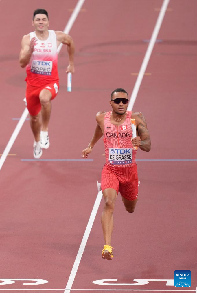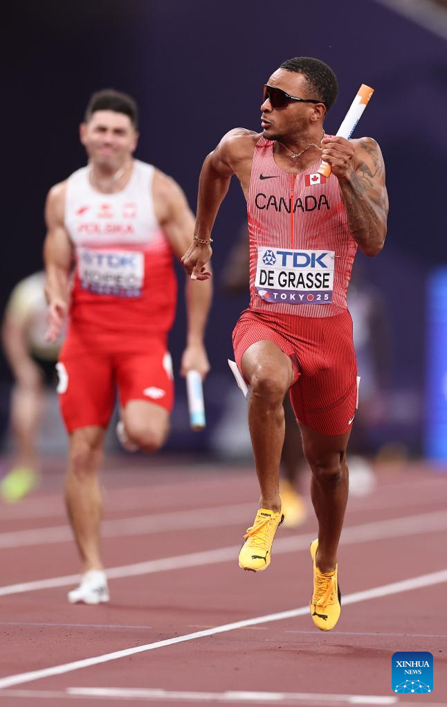 Andre De Grasse (R) of team Canada competes during the men's 4x100m relay heats at the 2025 World Athletics Championships in Tokyo, Japan, Sept. 20, 2025. (Xinhua/Ju Huanzong)