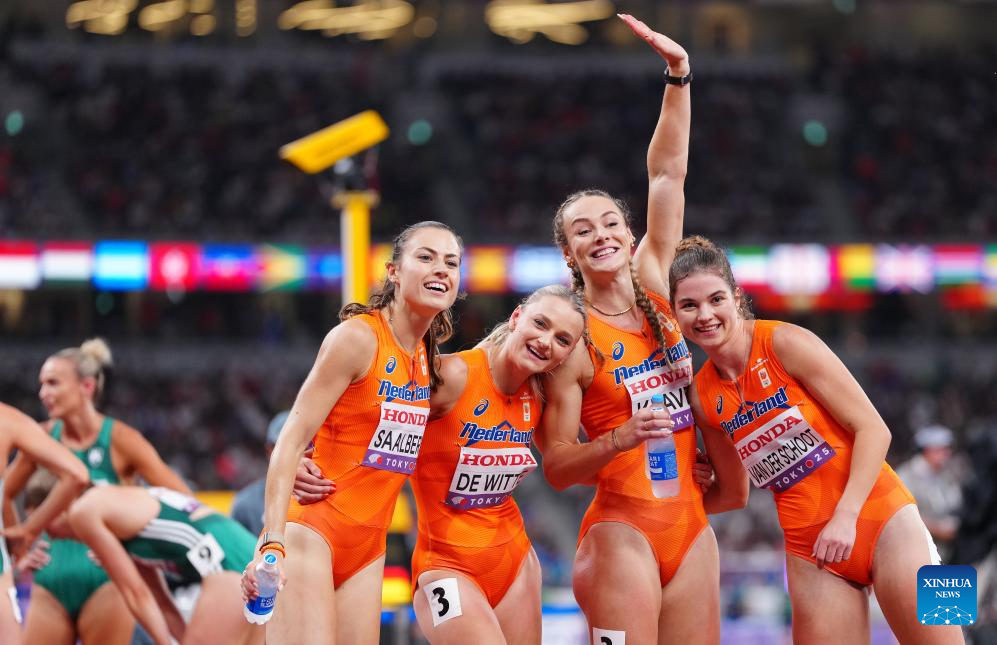 Team the Netherlands celebrate after the women's 4x400m relay heats at the 2025 World Athletics Championships in Tokyo, Japan, Sept. 20, 2025. (Xinhua/Jia Haocheng)