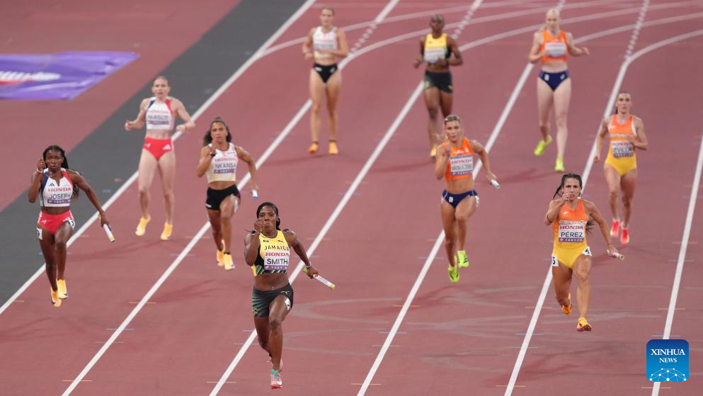 Jonielle Smith (4th L) of Jamaica competes during the women's 4x100m relay heats at the 2025 World Athletics Championships in Tokyo, Japan, Sept. 20, 2025. (Xinhua/Ju Huanzong)