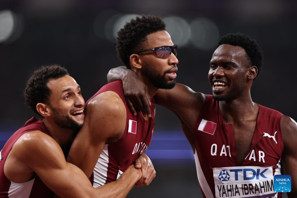 Abderrahman Samba (C) of team Qatar celebrates with teammates as they break the national record after the men's 4x400m relay heats at the 2025 World Athletics Championships in Tokyo, Japan, Sept. 20, 2025. (Xinhua/Jia Haocheng)