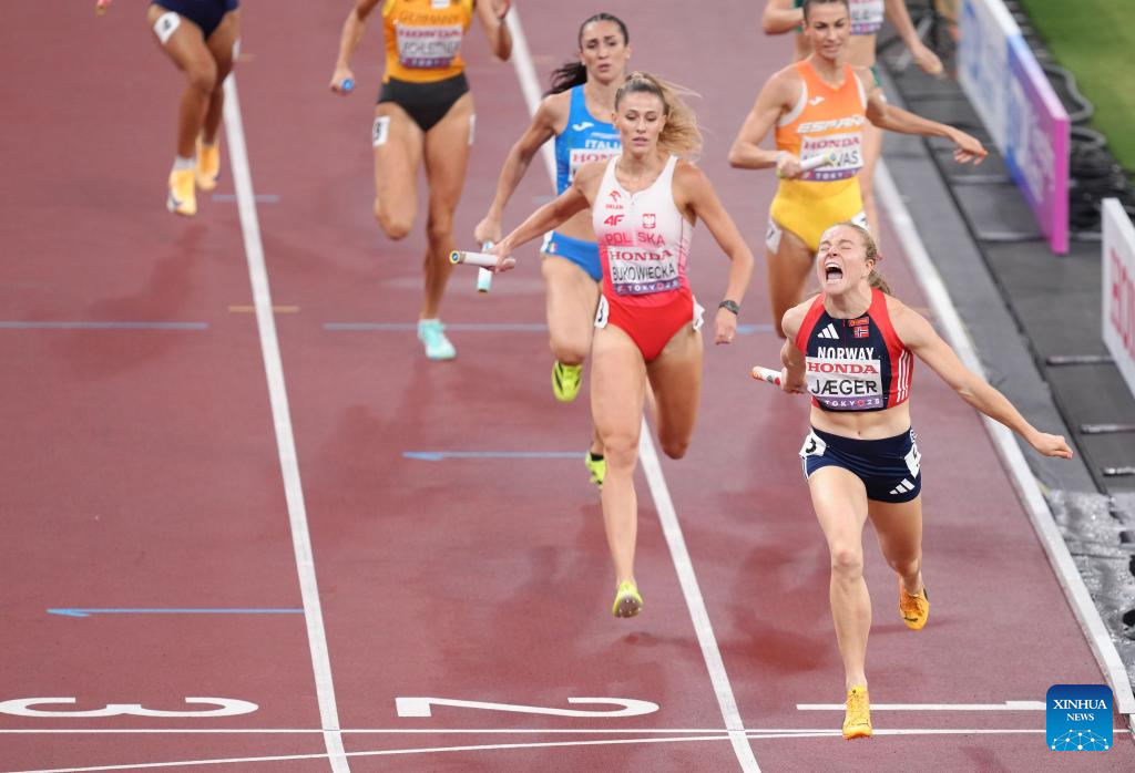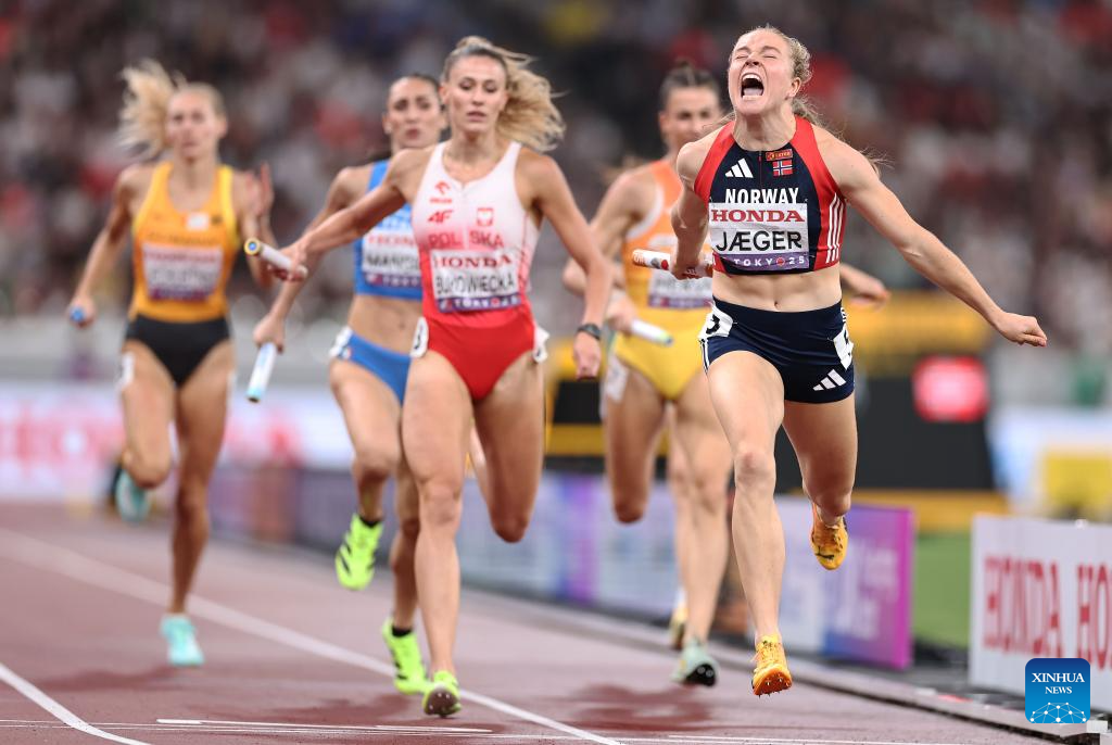 Henriette Jæger (1st R) of team Norway passes the finish line during the women's 4x400m relay heats at the 2025 World Athletics Championships in Tokyo, Japan, Sept. 20, 2025. (Xinhua/Ju Huanzong)