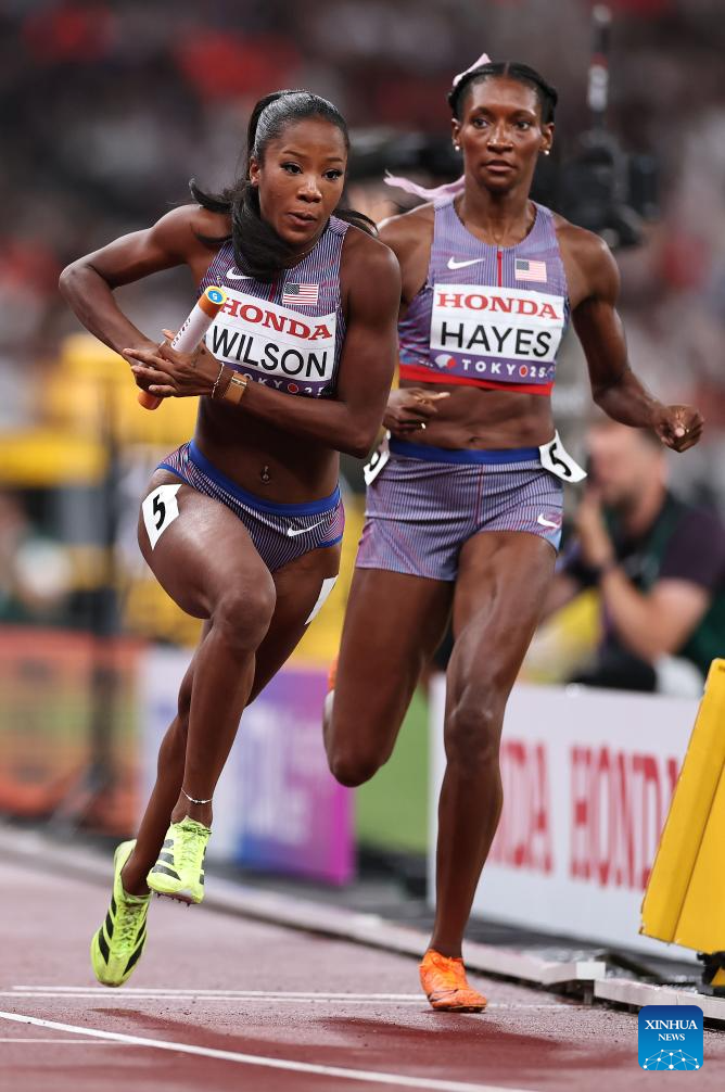 Britton Wilson (L) and Quanera Hayes of team the United States compete during the women's 4x400m relay heats at the 2025 World Athletics Championships in Tokyo, Japan, Sept. 20, 2025. (Xinhua/Jia Haocheng)