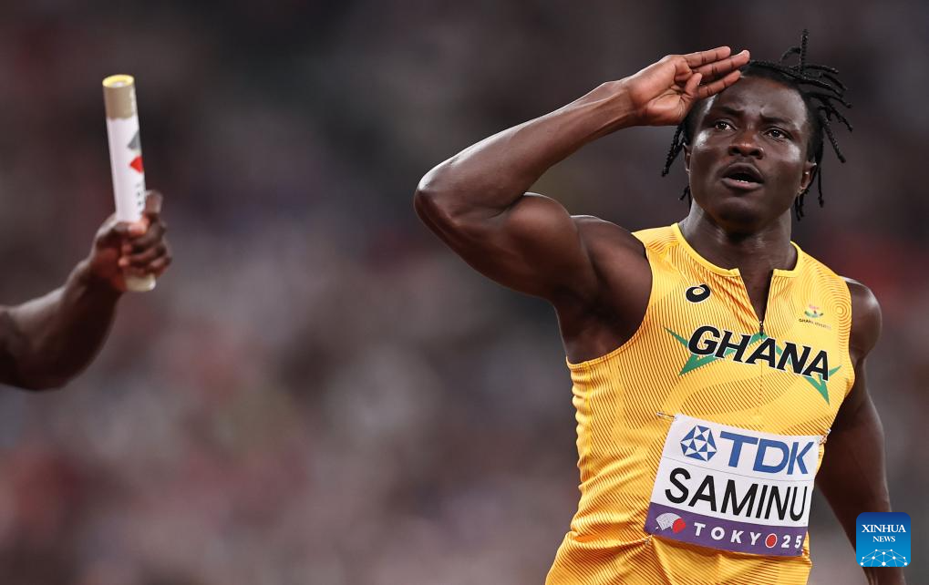 Abdul-Rasheed Saminu of team Ghana reacts after the men's 4x100m relay heats at the 2025 World Athletics Championships in Tokyo, Japan, Sept. 20, 2025. (Xinhua/Jia Haocheng)