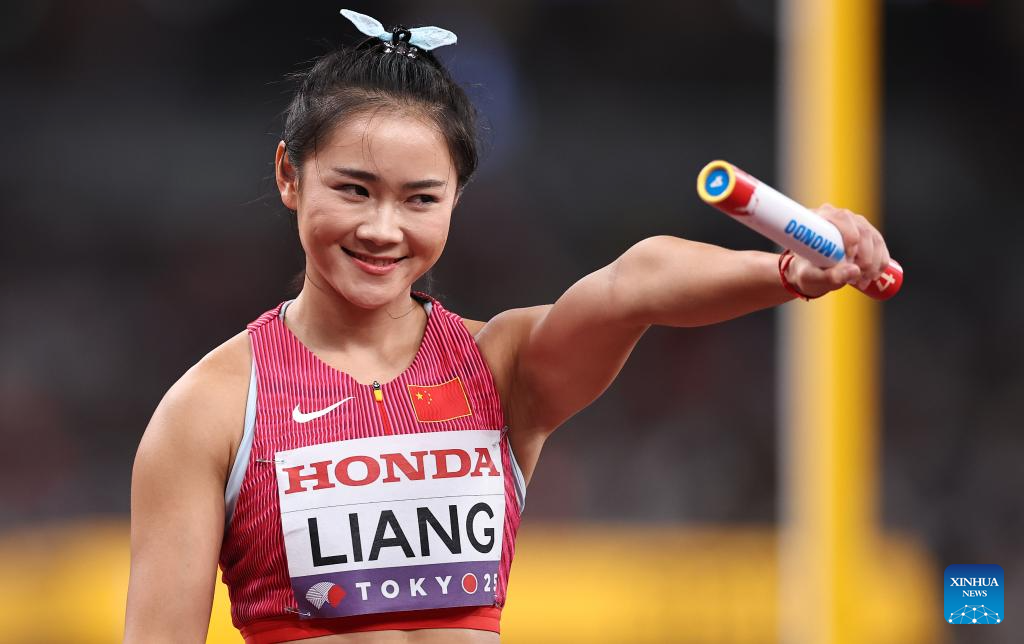 Liang Xiaojing of team China reacts before the women's 4x100m relay heats at the 2025 World Athletics Championships in Tokyo, Japan, Sept. 20, 2025. (Xinhua/Jia Haocheng)